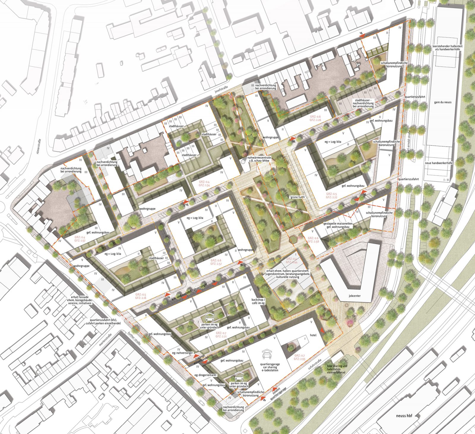 Eine wichtige Neusser Wegeverbindung durchquert schon heute das Areal. Sie verbindet die Stadtteile Furth-Süd, Furth-Mitte und Weißenberg mit dem Hauptbahnhof und dem Neusser Stadtzentrum. Um diese Achse entsteht das zentrale Element des neuen Stadtquartiers, die grüne Furth im Inbus-Viertel. Wie ein Platzband schafft sie einen neuen Ort mit eigener Identität und bildet das Rückgrat für das ganze Quartier. Hier sind auch identitätsstiftende bauliche Elemente, wie die historische Werkhalle und der vorhandene Schornstein der Fa. Bauer und Schaurte verortet. Spiel- und Freizeitbereiche bieten der Bevölkerung zukünftig ein abwechslungsreiches Freiraumerlebnis. Kleinere Plätze an der alten Halle, am Hotel und an Endpunkten der Erschließungswege werden zu zentralen Treffpunkten in der Achse. Durch die Vor- und Rücksprünge im städtebaulichen Layout wird ein abwechslungsreiches Raumerlebnis entwickelt. Entlang der Karl-Arnold-Straße wird der angrenzende nördliche Grünzug von der Südliche Furth konsequent fortgesetzt. Bestehende bauliche Nebenanlagen sowie einige Gebäude werden zugunsten eines großräumigen Grünzuges aufgegeben. In der Further Straße werden ergänzend zum Baumbestand neue Straßenbäume vorgesehen.