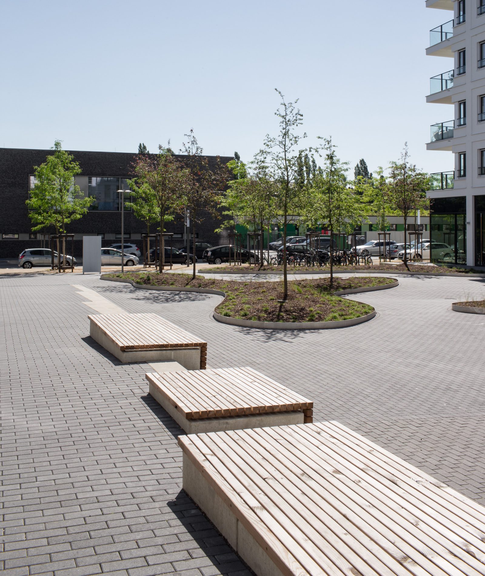 Vor dem Turm unterbrechen amorphe Pflanzflächen mit einer Stahleinfassung den homogenen Platz. Bepflanzt mit rosarot blühenden Zieräpfeln bilden die farbenprächtigen Bäume im Frühjahr einen Kontrast zur weißen Fassade. Vier auf dem Platz verteilte Ahornbäume lockern die strenge Platzform auf. Eine Unterpflanzung der Bäume mit Gräsern verbindet die Pflanzflächen optisch miteinander. Eine ca. 1,00 Meter hohe immergrüne Hecke grenzt den Bereich der Außengastronomie vom Platz ab, ohne die Sicht der Bistrobesucher auf diesen zu versperren.