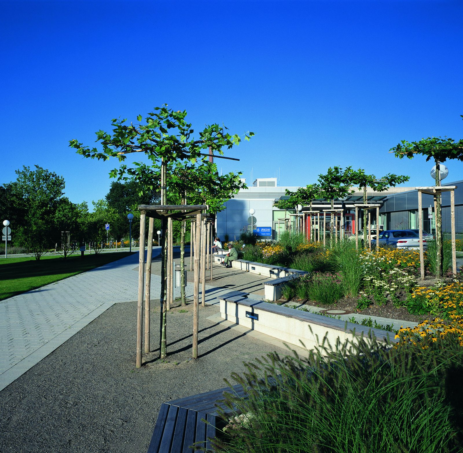 Zwischen Haupteingang und Notaufnahme liegt der so genannte Gesundheitsplatz. Durch einen Höhenversprung haben wir hier ein einladendes Sitzelement eingerichtet. Überdeckt von einem Dach aus kleinkronigen, geschnittenen Platanen, im Rücken eine vielfarbige Staudenrabatte, mit Ausblick auf eine Rasenfläche, bepflanzt mit blühenden Solitärsträuchern. Der Platz ist Ausgangspunkt einer Baum bestandenen Fußgängerzone, die künftig das Krankenhaus mit der benachbarten neuen Wohnsiedlung am Altenhof verbinden wird.