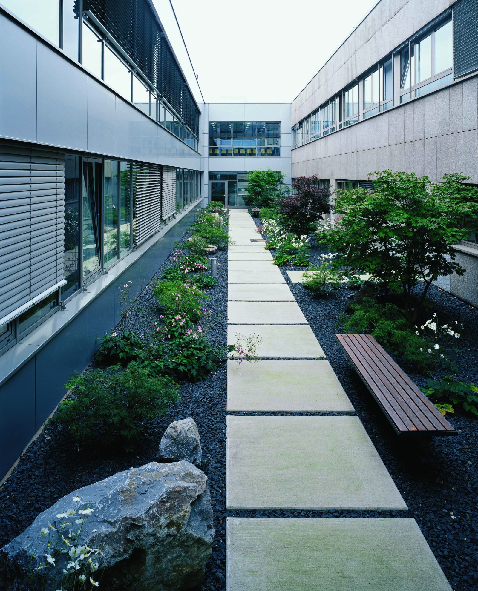 Gegenstück zum lebhaften Eingang ist der meditative Garten zwischen Empfangshalle und Behandlungsbereichen. Mit Immergrünem Bambusgras, weissblühenden Herbst-anemonen, japanischem Ahorn, Kiesschüttungen mit Steingruppen und groß-formatigen Platten haben wir eine fernöstlich anmutende Atmosphäre der Ruhe und Kontemplation geschaffen.