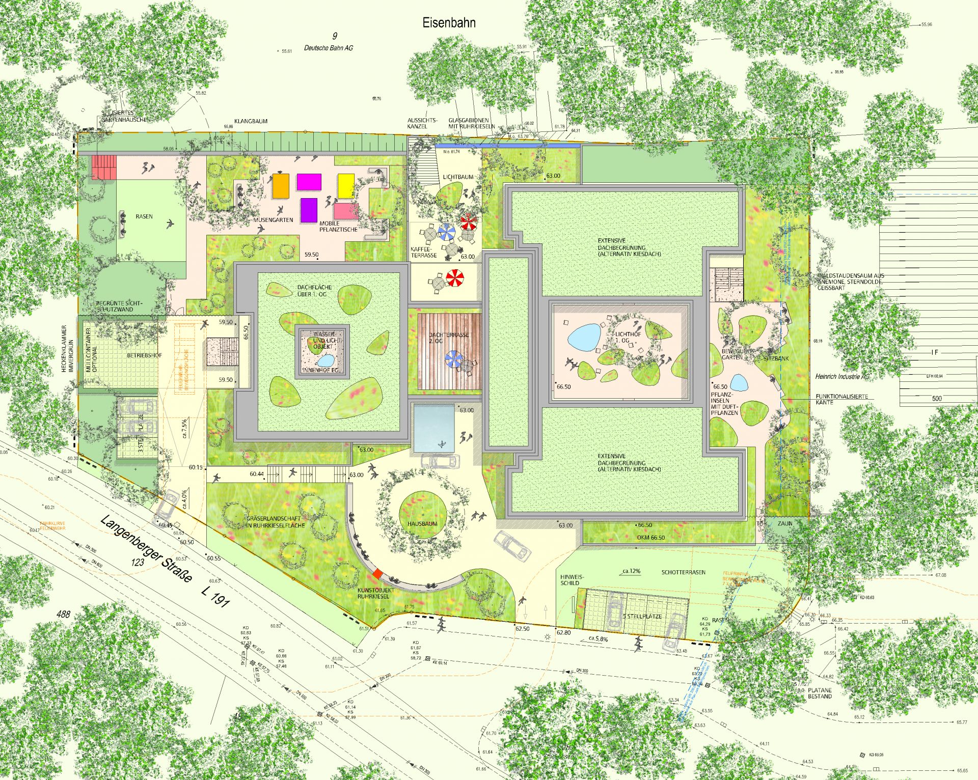 Der sich im Norden angliedernde Bewegungsgarten zieht sich thematisch als eine Symbiose von Wasser, Steinen, Duft in Assoziation an die Ruhraue, durch die Innenhöfe des Gebäudes hindurch. Eine funktionalisierte Kante mit der Möglichkeiten, in Nischen unterschiedlicher Größe zu verweilen übernimmt gleichzeitig leitende Funktion der Wege. Kieselartig sind Pflanz- und Wasserinseln eingestreut, die den Garten mit ihrem Duft und Klängen haptisch bereichern.