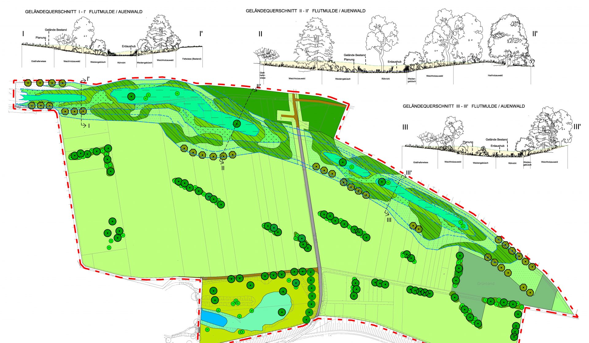 In den Randbereichen der Flutmulde werden Bepflanzungen vorgenommen, die den Belangen der Kulturhistorie und des Artenschutzes Rechnung tragen.