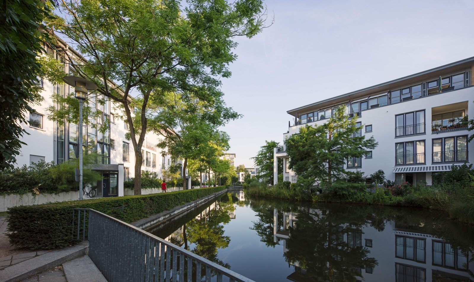 Die Umnutzung von Gewerbegebieten bietet ganz besondere Gelegenheiten, völlig neue Lebens- und Wohnqualitäten in traditionellen Stadtgebieten zu etablieren. Dort, wo früher die Busse der Kölner Verkehrsbetriebe gewartet wurden – zwischen Hermeskeiler Platz und Beethovenpark – erstreckt sich heute eine großzügige Wasserfläche, die beidseitig von einer Wohnbebauung flankiert wird.
