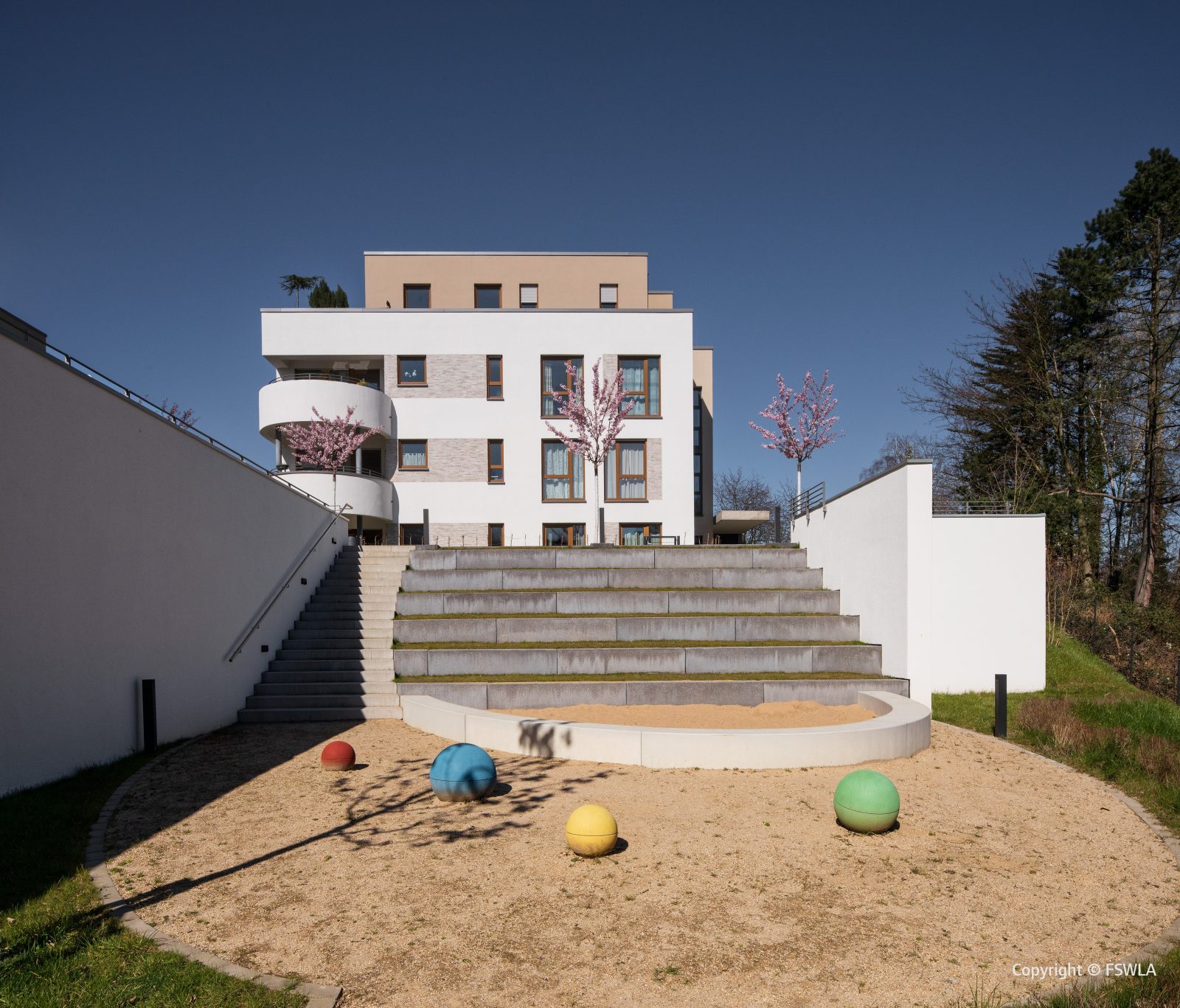 Entlang der zentralen Achse spannen sich zwei kleinere Plätze an den Eingängen der Punkthäuser auf. Den Endpunkt der Achse bildet ein weiterer großer Platz, der analog zum Eingangsplatz mit einer elliptischen Bank aus Sichtbeton gestaltet wurde. Eine großzügige Sitzstufen- und Treppenanlage führt auf den tiefer liegenden Sandspielplatz mit Spielgeräten, der durch eine weitere elliptische Sitzeinfassung gerahmt wird. Die angrenzende Rasen- und Wiesenfläche bietet zusätzlichen Raum zum Spielen.