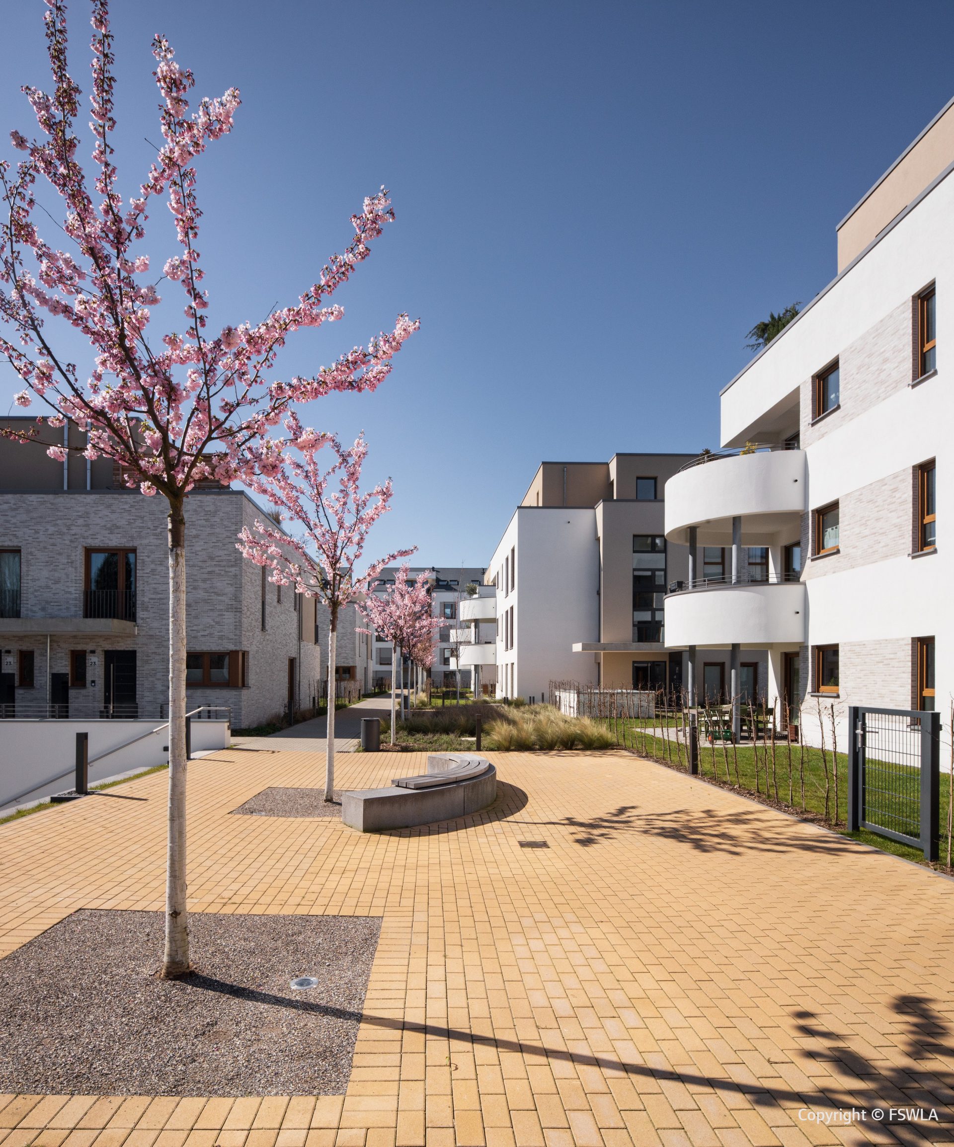 Durch einen lichten Toreingang an der Veronikastraße wird das Baufeld fußläufig erschlossen. Ein großzügiger Eingangsplatz aus Betonsteinpflaster bildet den Auftakt und empfängt die Bewohner mit einer einladenden Geste. Eine elliptische Platzbank unter einem Solitärbaum lädt zum Verweilen ein. Beginnend am Platz erschließt eine zentrale Wegeachse die rückliegenden Gebäude. Betont wird diese durch eine Kirschbaumreihe, die die Gestaltung der Rüttenscheider Straße aufgreift.