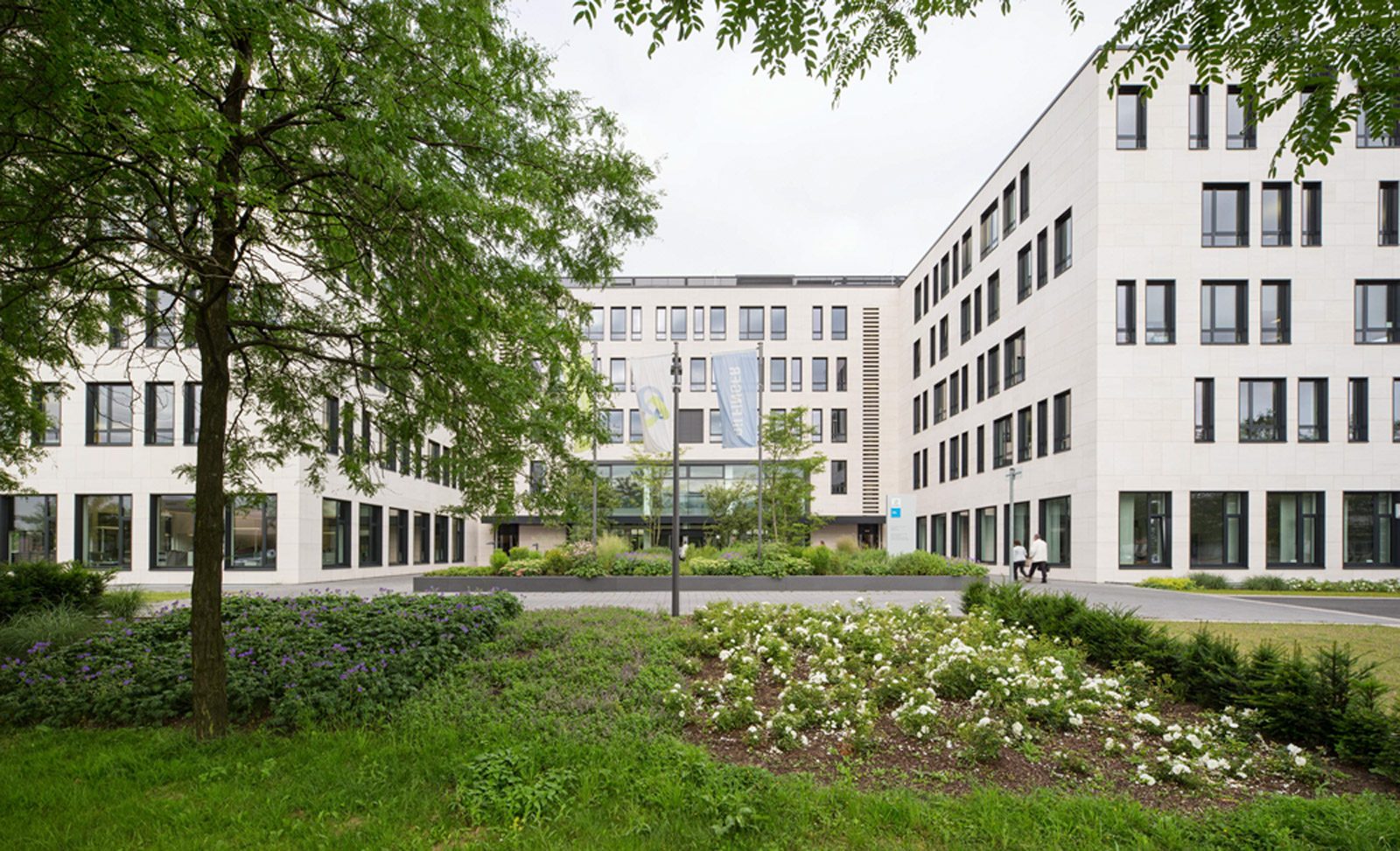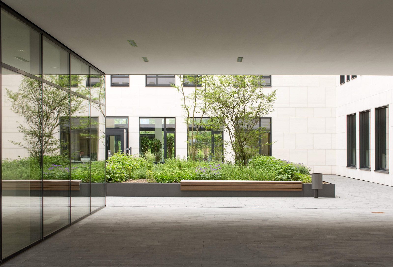 Die solitäre Platzierung des Gebäudes zoniert den Freiraum in vier Bereiche. Im Nordosten, zur Adresse Europaallee, erweitert sich der Eingangshof in eine großzügige Vorfahrt. Verwoben wird diese Situation mit einem Freiraumkonzept, das sich wie ein Band um das Gebäude legt. Dieses „Gestaltungsband“ beinhaltet eine einheitliche und doch abwechslungsreiche Bepflanzung mit Bodendeckern in verschiedenen Höhen, Gehölzen und Bodenbelägen.