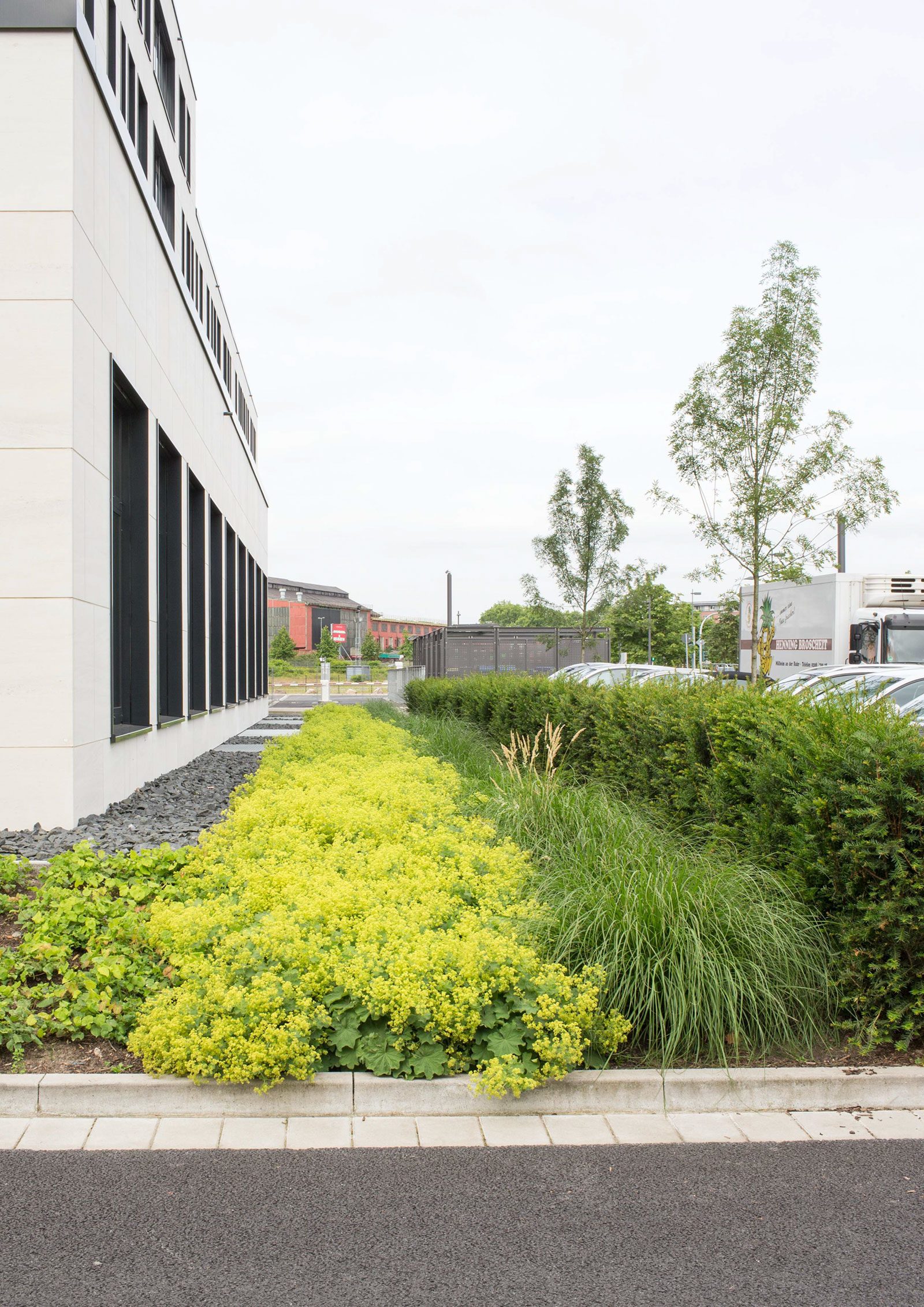 Die solitäre Platzierung des Gebäudes zoniert den Freiraum in vier Bereiche. Im Nordosten, zur Adresse Europaallee, erweitert sich der Eingangshof in eine großzügige Vorfahrt. Verwoben wird diese Situation mit einem Freiraumkonzept, das sich wie ein Band um das Gebäude legt. Dieses „Gestaltungsband“ beinhaltet eine einheitliche und doch abwechslungsreiche Bepflanzung mit Bodendeckern in verschiedenen Höhen, Gehölzen und Bodenbelägen.