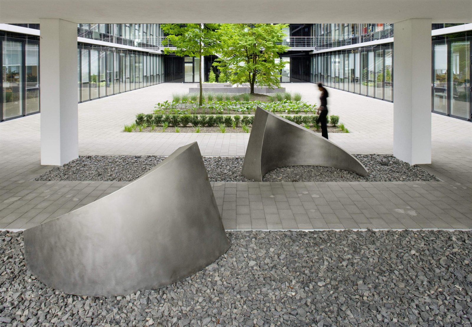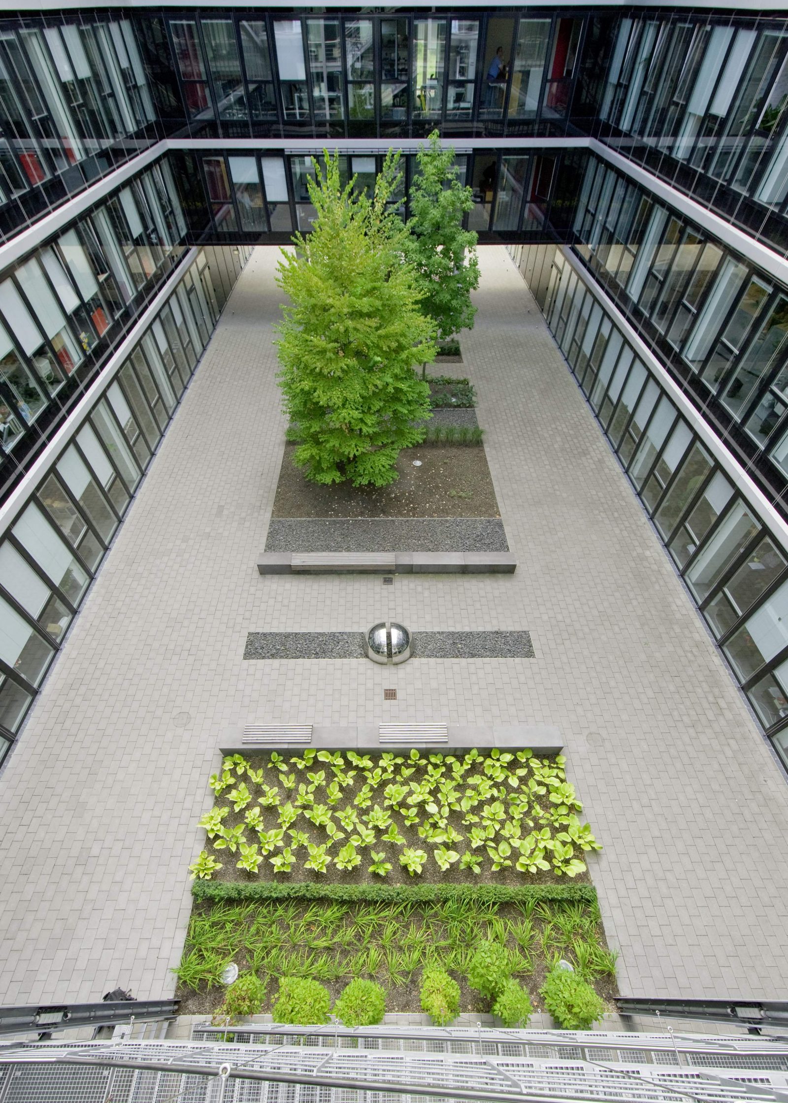 In den Innenhöfen wechseln sich rhythmisch verschiedene Elemente ab: Pflanzflächen, Schotterstrukturen und Sitzflächen. Eingestreute Einzelbäume lockern die Struktur auf und geben eine vertikale Orientierung. Die Dachflächen werden extensiv begrünt.