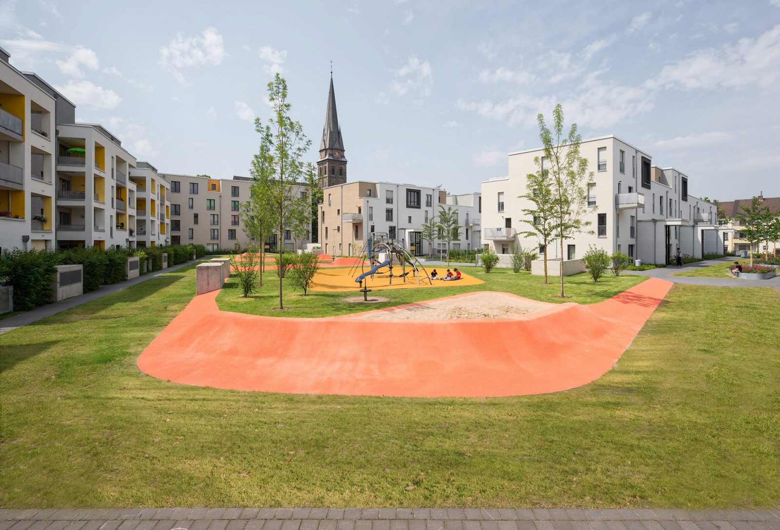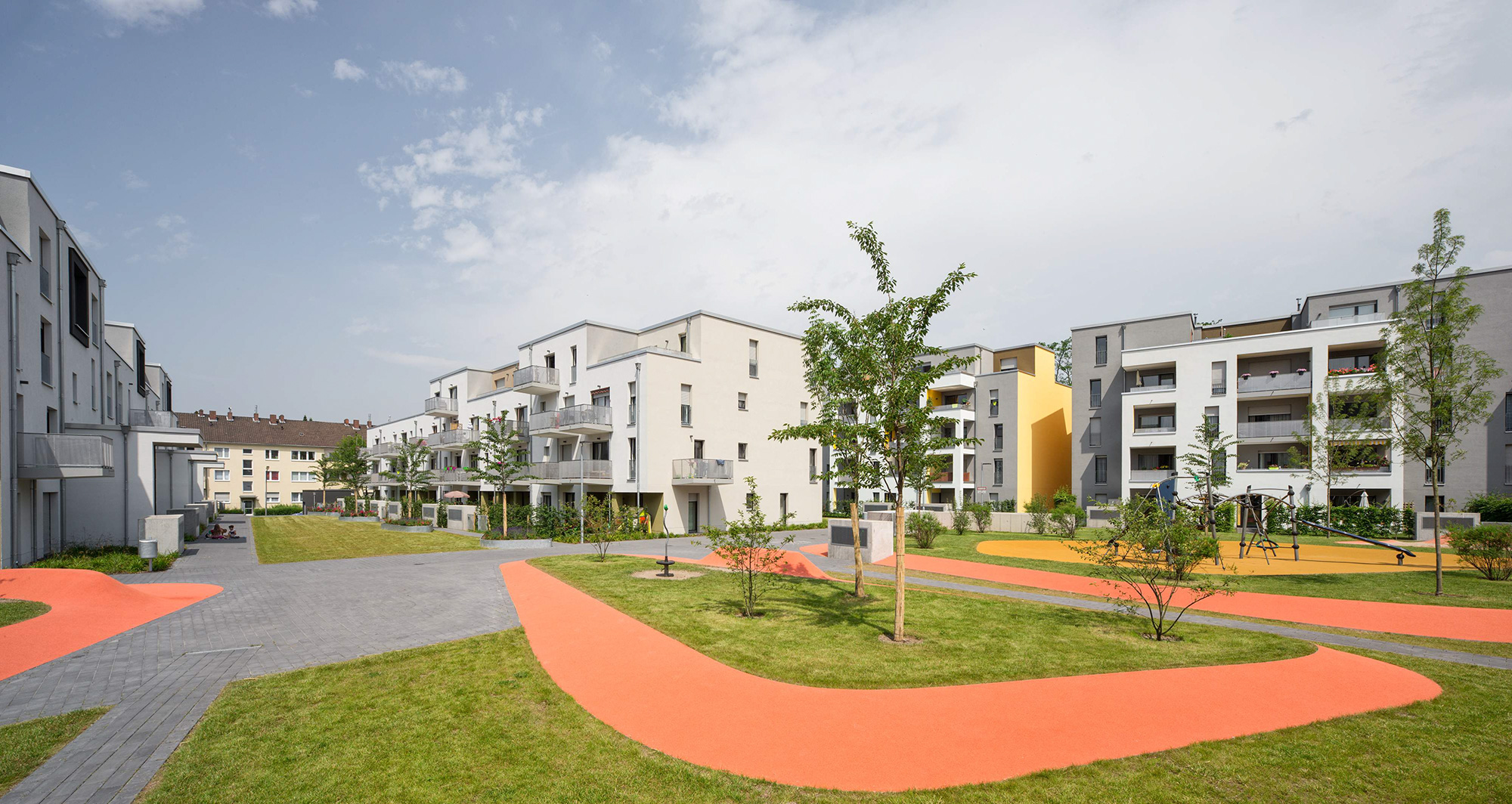 Große Teile der Hoffläche werden im Rettungsfall von der Feuerwehr befahren, um Wohnungen, deren Fenster zum Innenhof ausgerichtet sind, anleitern zu können. Diese Feuerwehrzufahrten und Aufstellflächen werden durch angrenzende Hecken, Hochbeete oder Böschungen der Spielinseln für die Feuerwehr markiert, ohne direkt den Eindruck von funktionalen Flächen zu erwecken.