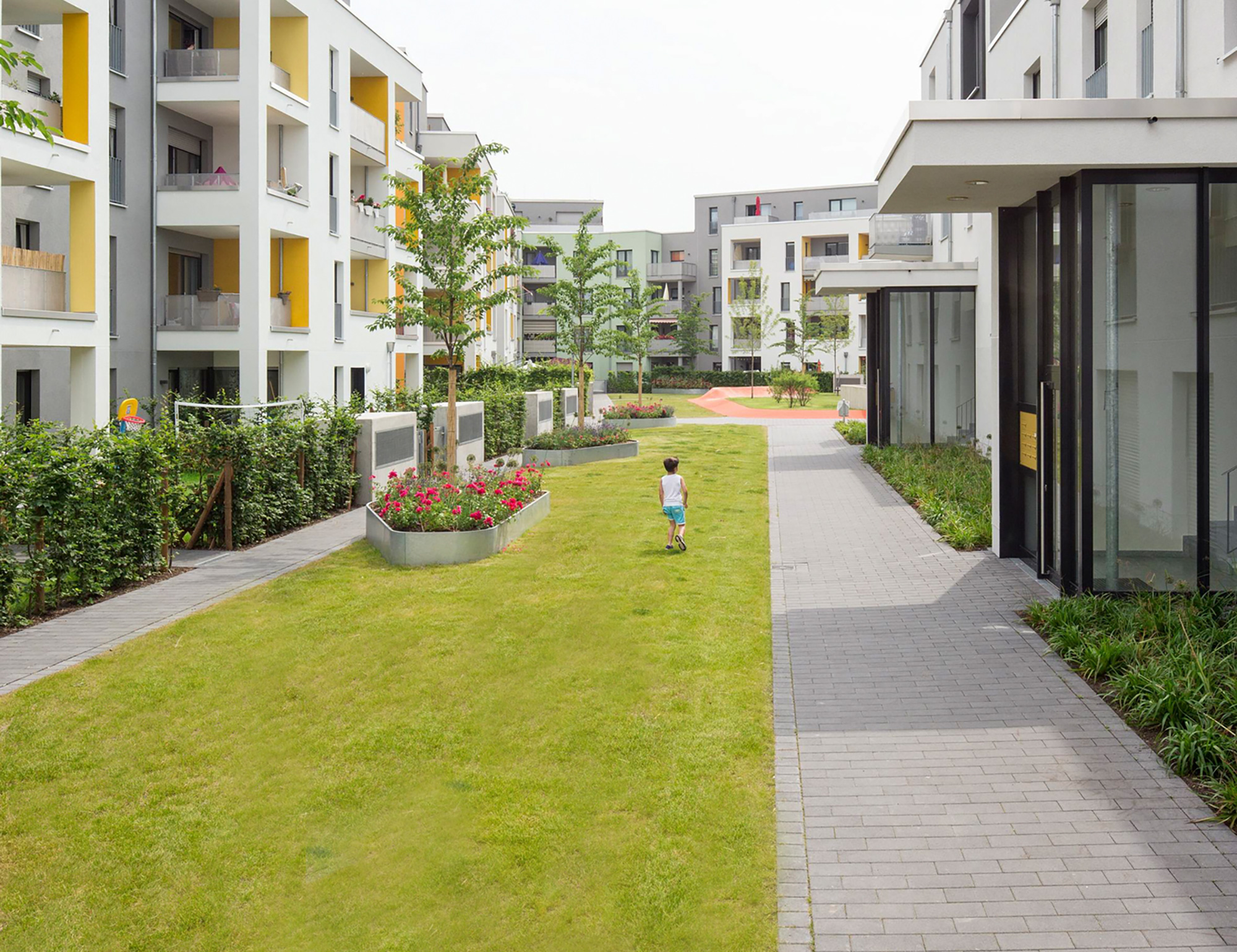 An den Eingangsseiten der Häuser werten Pflanzstreifen aus Gräsern die Sockelbereiche auf und schaffen eine notwendige Distanz zu den Fenstern. An den öffentlichen Gehwegen sind diese Beete zusätzlich überhöht mit dem gleichen Höhenniveau wie der Innenhof.