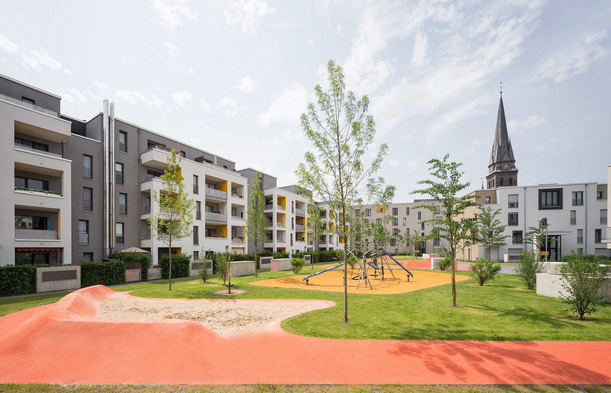 Markantestes Element der Hofgestaltung sind die drei Spielinseln, die wie Schollen in der Platzfläche „treiben“. Diese Inseln sind um 30 cm überhöht. Dadurch können größere Bäume und Sträucher gepflanzt werden und zusätzlich markieren die Außenkanten die Fahrwege für die Feuerwehr. Die Böschungen an den Rändern werden mit orange eingefärbtem Fallschutzgranulat belegt. Die Farbe Orange harmoniert mit der Fassadengestaltung und signalisiert den Kindern überdeutlich: „Hier ist spielen erlaubt!“