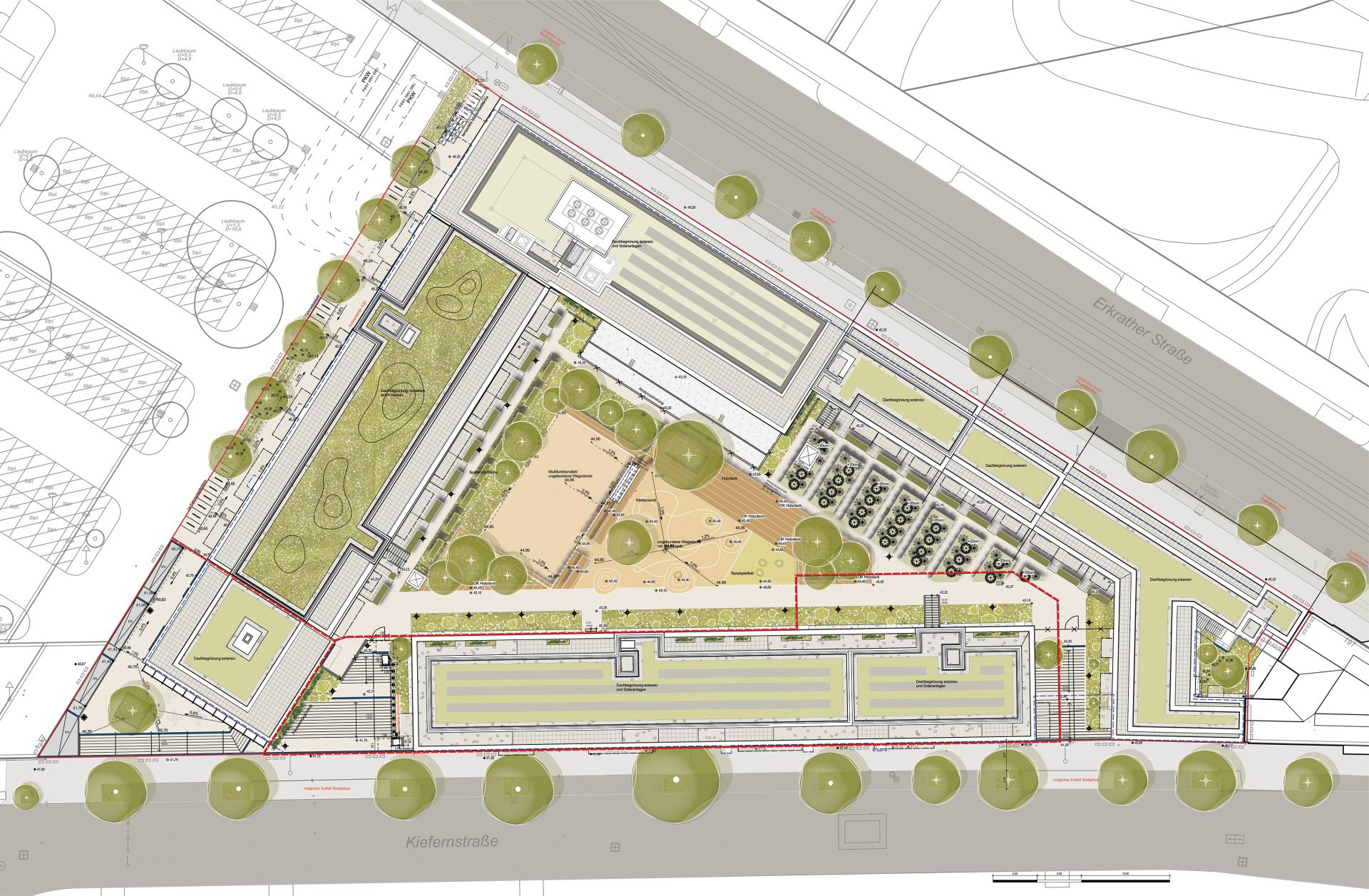Der Mischnutzungsneubau an der Erkrather Straße/Kiefernstraße wird durch die Freianlagenplanung von den Dachbepflanzungen, des Innenhofs und dem Anschluss an den öffentlichen Straßenraum unterstützt. Das Plangebiet zeichnet sich durch seine Höhendifferenz von einer vollen Etage aus.