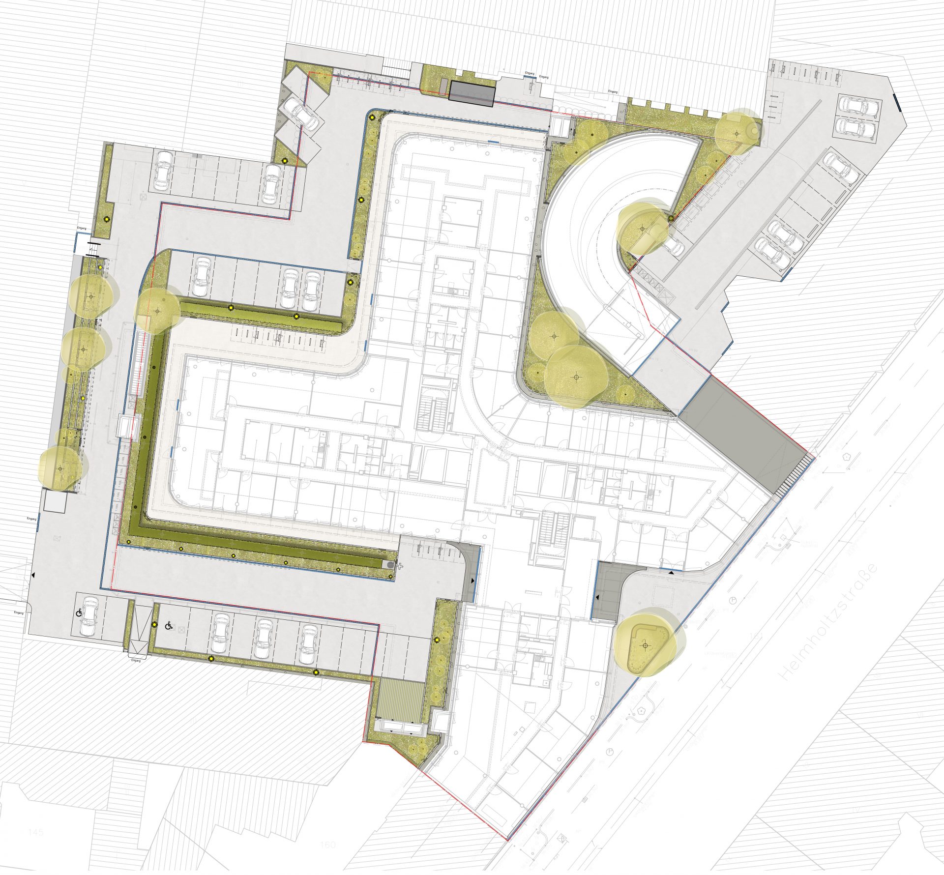 Das geplante neue Bürogebäude wird in einer innerstädtischen Innenhofsituation in dem Dreieck Luisentraße, Helmholtzstraße und Scheurenstraße errichtet. Aufgrund der Neubebauung wird der ehemals zusammenhängende Hof in zwei Bereiche unterteilt. Beide Bereiche werden teilweise den Bestandsgebäuden und dem Neubau zugeordnet, aber größtenteils gemeinsam genutzt. Zusätzlich entsteht an der Helmholtzstraße am Eingang des Neubaus ein kleiner Vorplatz.