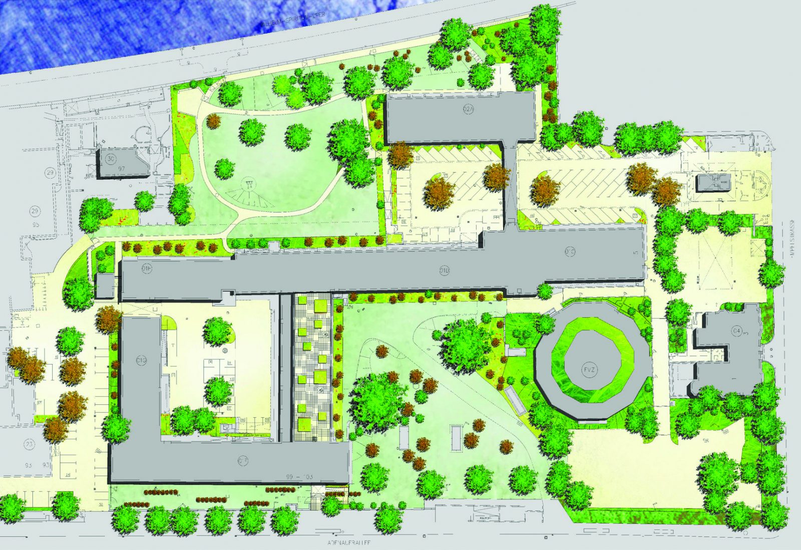 Im Zuge dieser Baumaßnahme wurden auch die Außenanlagen saniert. Eine abwechslungsreiche Parklandschaft, neue Dachgärten und Aufenthaltsbereiche im Freien gliedern heute den großzügigen Freiraum.