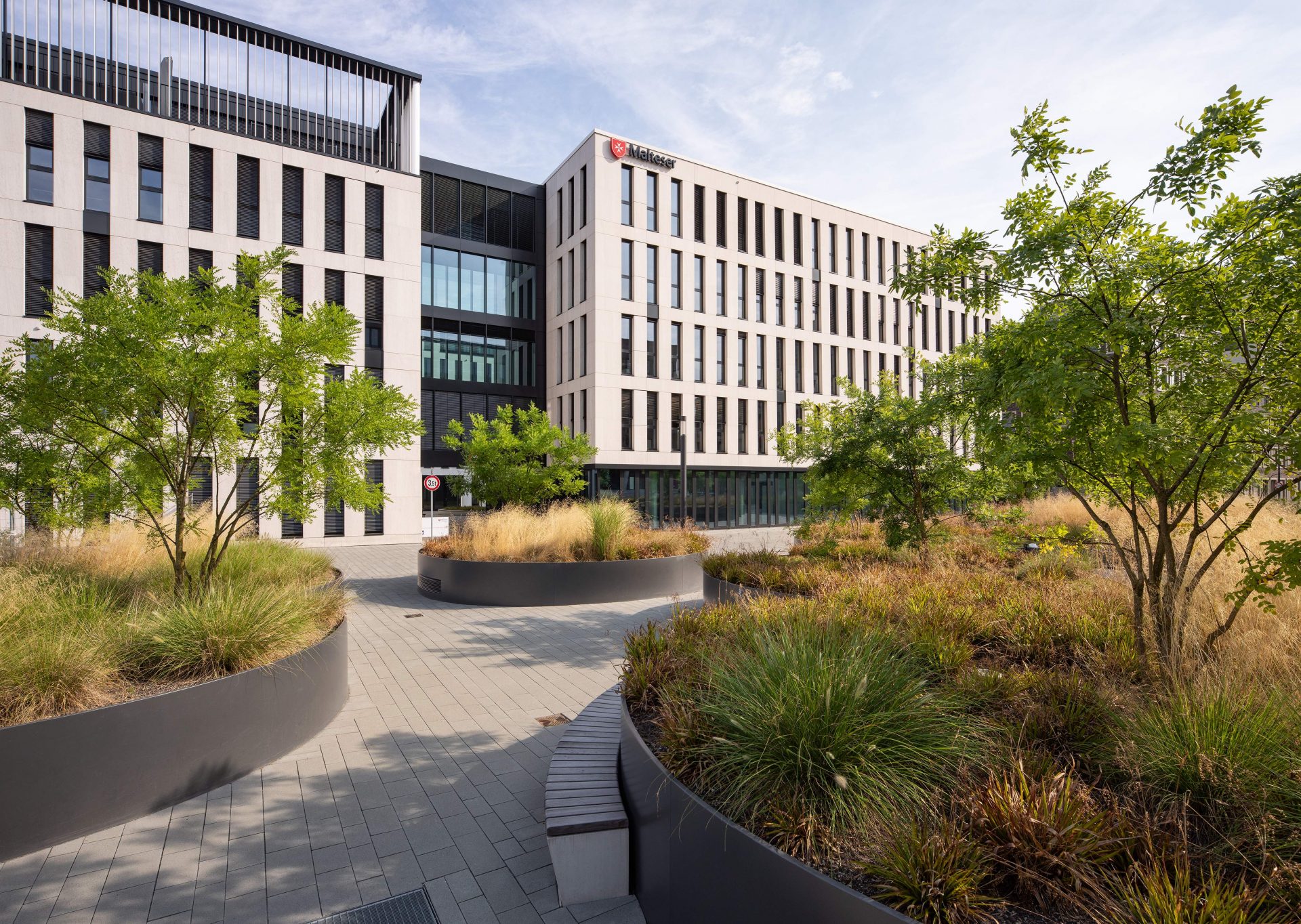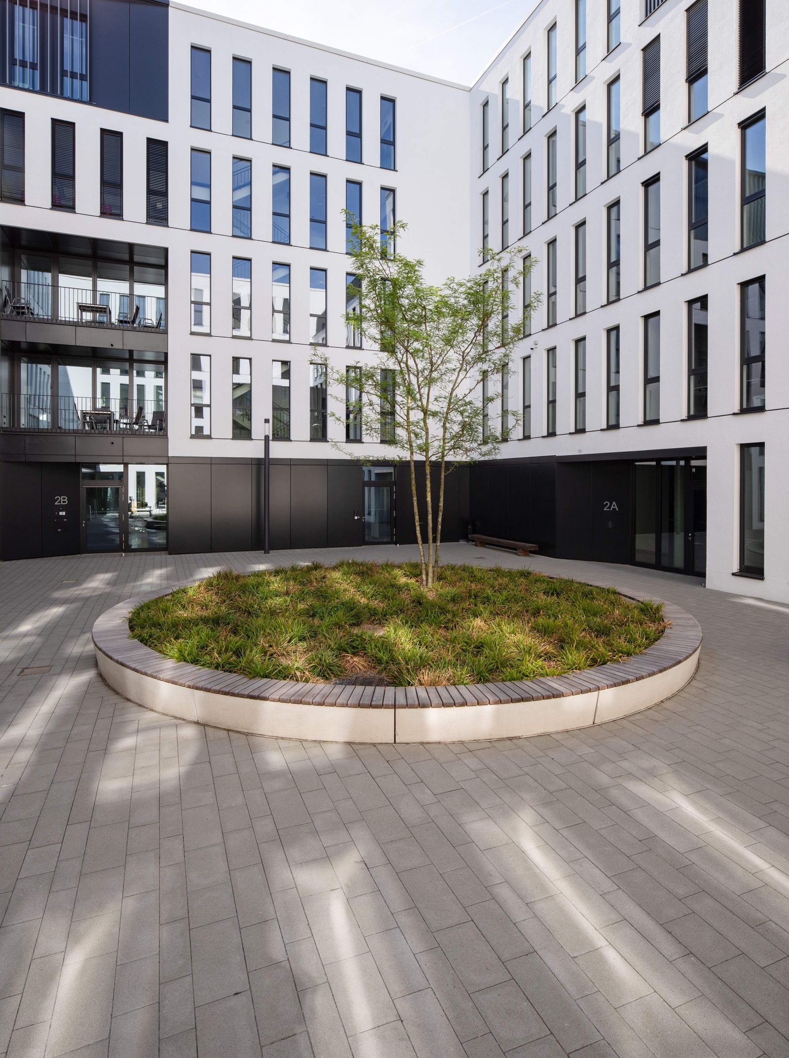 Der Hof, der von allen Gebäudeteilen zugänglich ist, wird in seiner Materialität analog zum Platz gestaltet. Die mit Stahl in Kombination mit Beton eingefassten Hochbeete des Platzes finden sich auch im Hof wieder und verknüpfen diese thematisch miteinander.