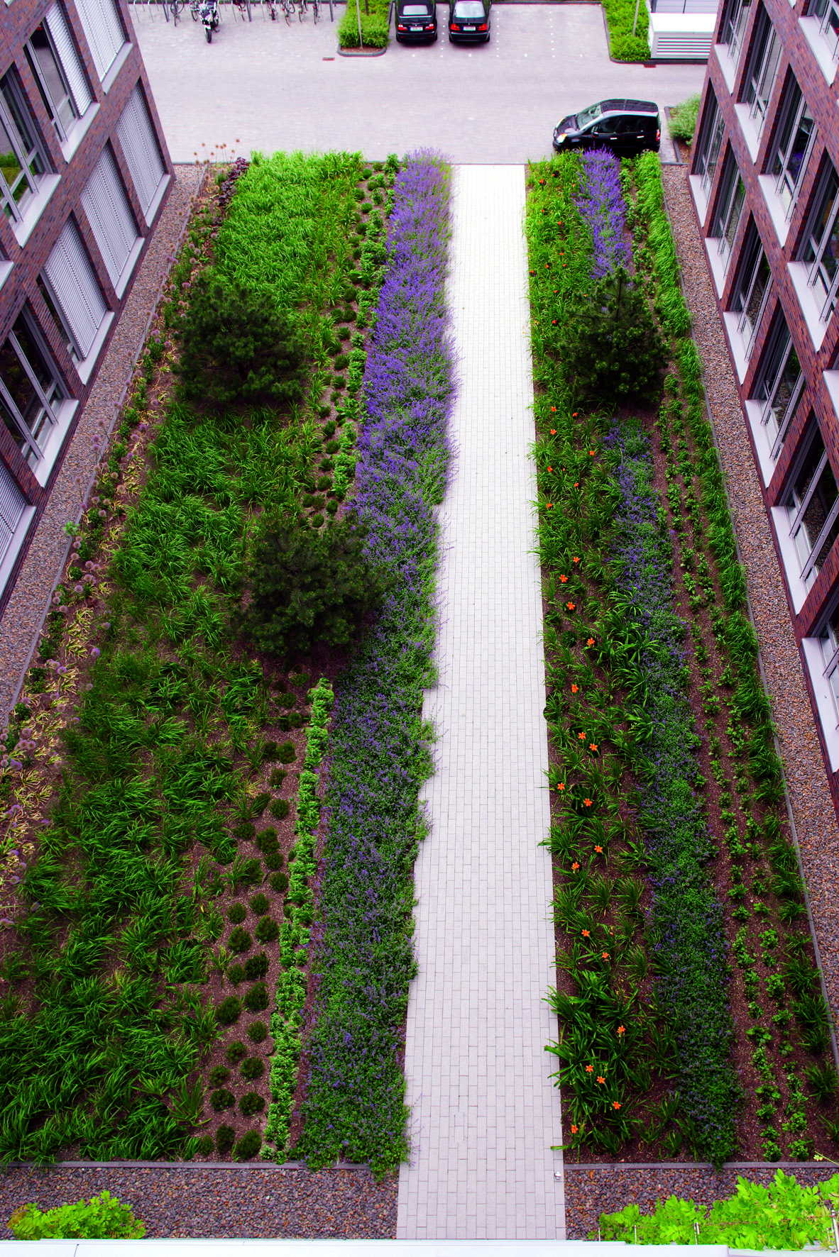 Die Innenhöfe des Gebäudes wurden mit schattenverträglichen Staudenpflanzungen begrünt. Eine funktional gestaltete Liegendanfahrt bietet neben Zufahrten für die Rettungswagen Stellplätze, die mit Hecken umpflanzt werden.