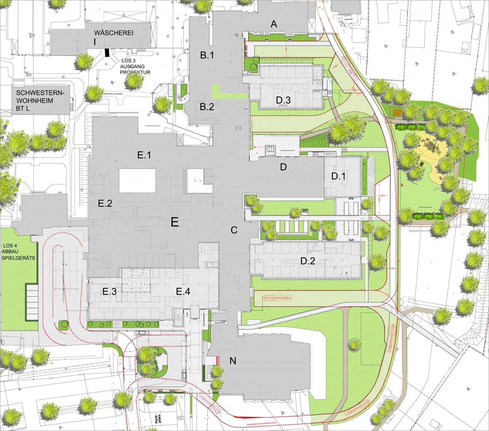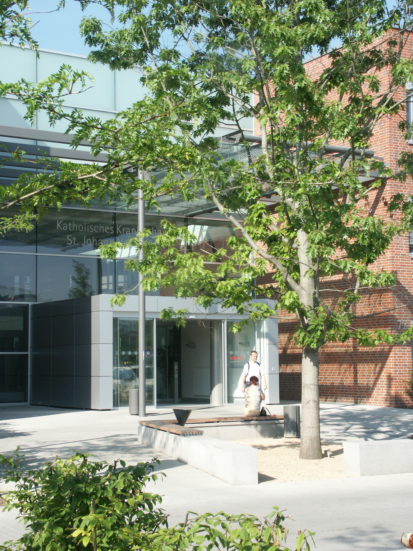 Im Rahmen der An- und Umbauten der Gebäude der Kliniken wurde ein völlig neues Gesamtbild der Außenanlagen hergestellt. Dabei entstanden ein großzügiger Haupteingangsplatz, eine neue Liegendanfahrt und individuell gestaltete Patientenhöfe.