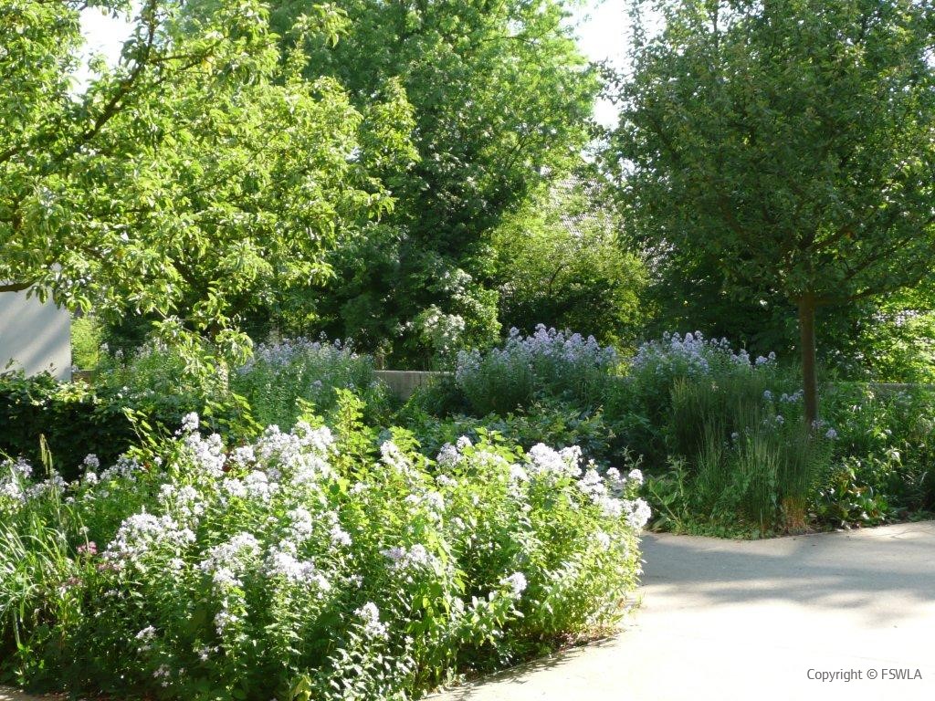 Wie zufällig situierte Pflanzgruppen entlang der Plattenkante bestehend aus weiß blühenden Waldanemonen, Trichterfarmen und Astrantien, als auch Gräserschmielen heben die Stringenz der Kanten auf und korrespondieren mit den Innenräumen. Der Hof erhält seinen Abschluss durch zwei stählerne Gartentore, sowie ein drittes, raumteilendes, symbolisches Gartentor. Der umlaufende Gräsersockel als auch die Böschungen werden mit einer Gräsermischung gestaltet, die Fingerhut und Lythrum als für Schlagfluren signifikante Arten beinhaltet.
