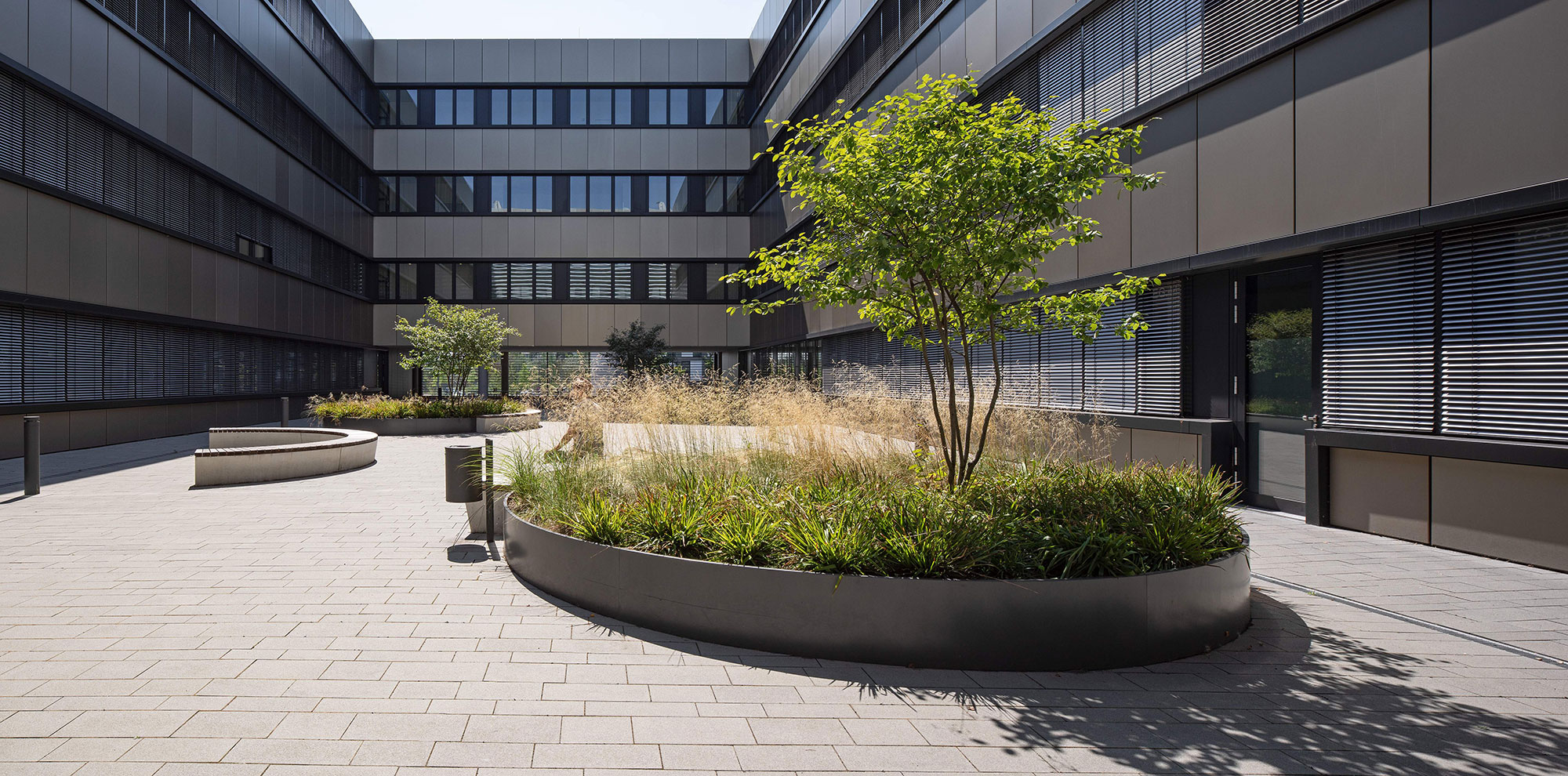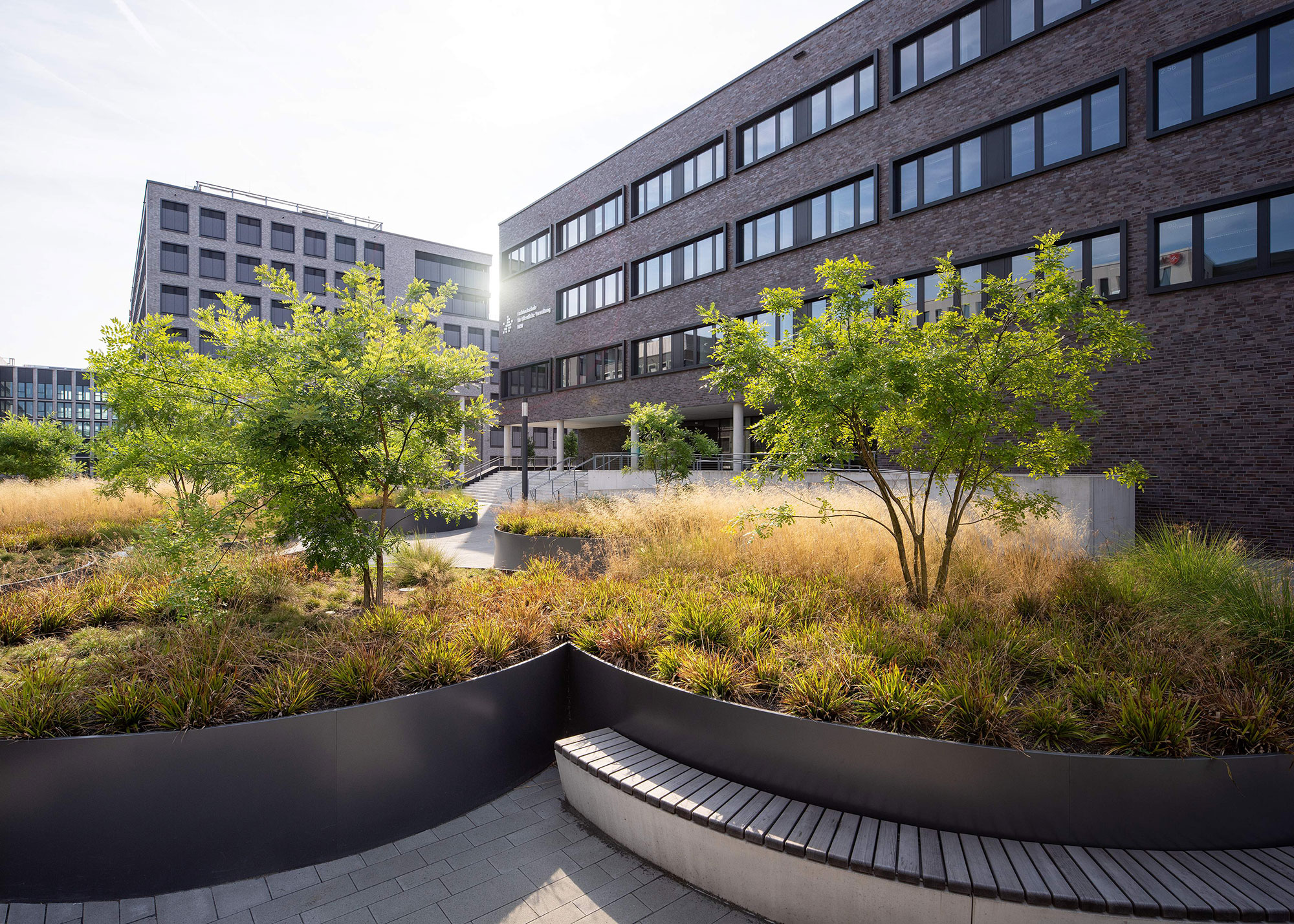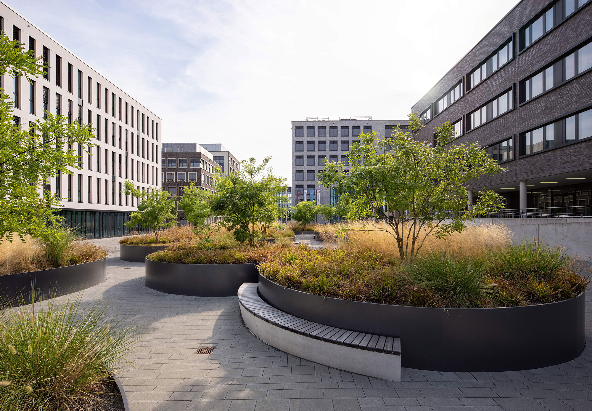 Der Stadtplatz – ein Raum für alle. Der Platz übernimmt wichtige Verbindungs- und Aufenthaltsfunktionen. Er fungiert als Bindeglied zwischen dem nördlichen und dem südlichen Baufeld und schafft durch seine zentrale Lage einen Konvergenz-Raum für die unterschiedlichen Nutzer. Prägendes Element auf dem Platz sind die großen baumbestandenden Hochbeete. Diese aus Stahl gefertigten und mindestens 25 Quadratmeter großen Beete bieten den Bäumen ausreichend Vegetationsraum auf der unterbauten Fläche. Durch ihre lockere Anordnung entsteht ein ganz besonderes Raumerlebnis. Durch Aufweitungen entstehen kleine Inseln zum Verweilen und Kommunizieren. Stahlbänke laden zum Sitzen ein. Rasen, Gräser und Staudenflächen unter den Bäumen schaffen eine angenehme Atmosphäre.