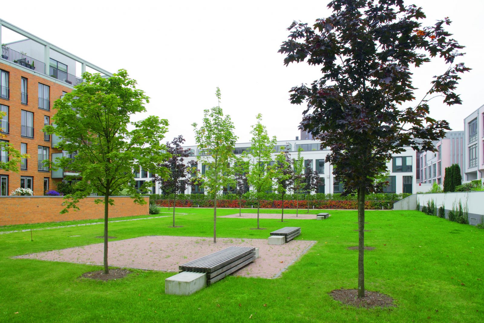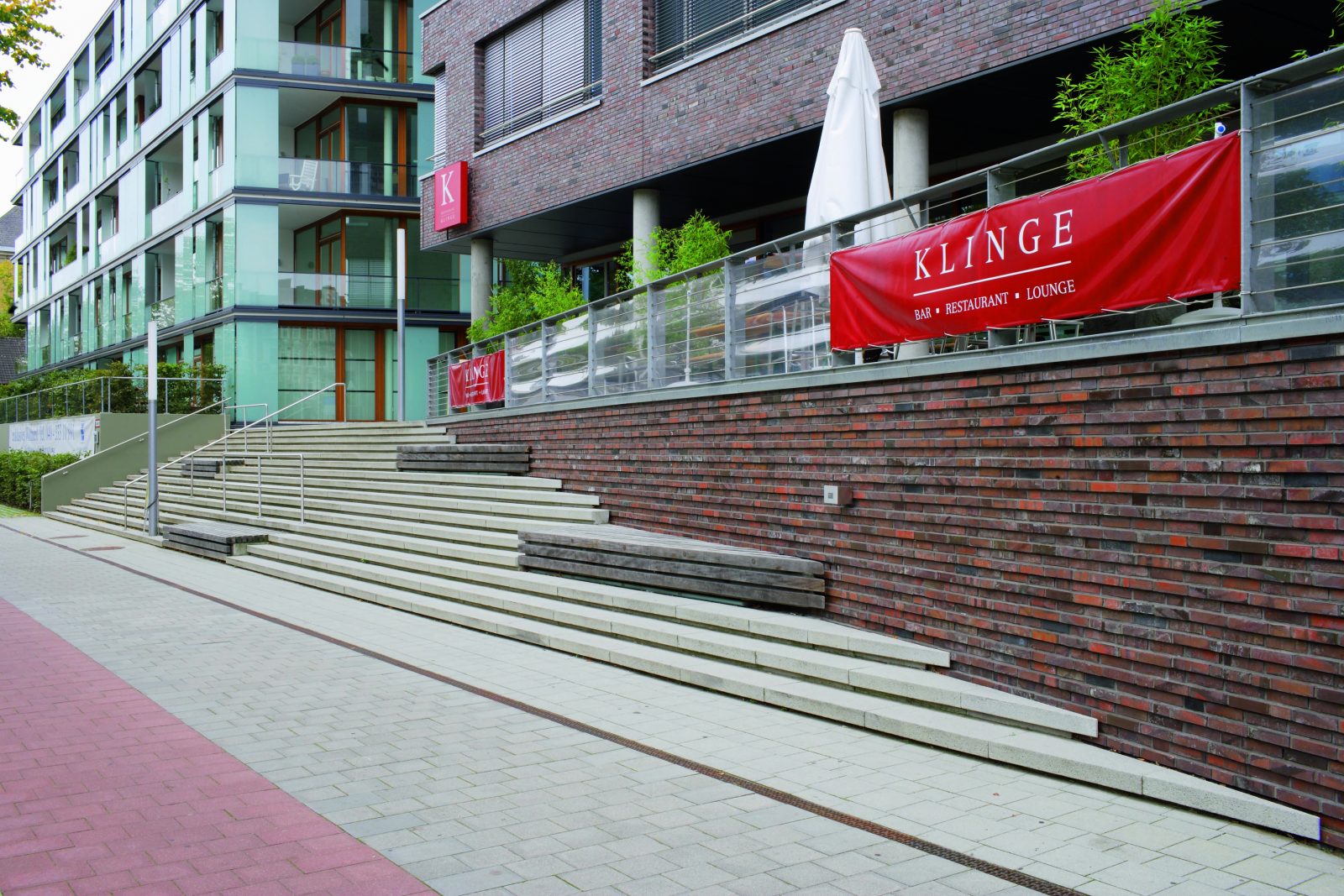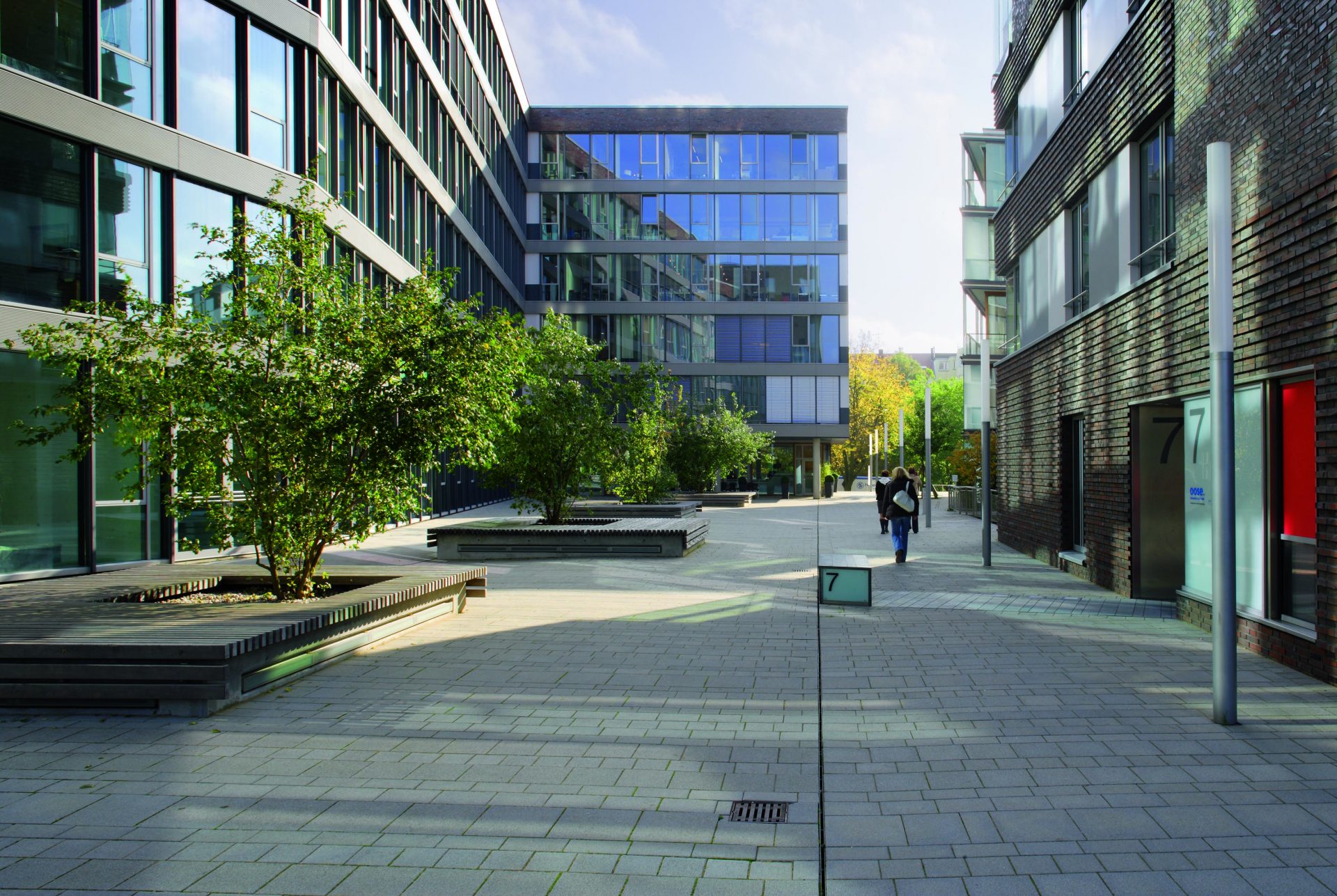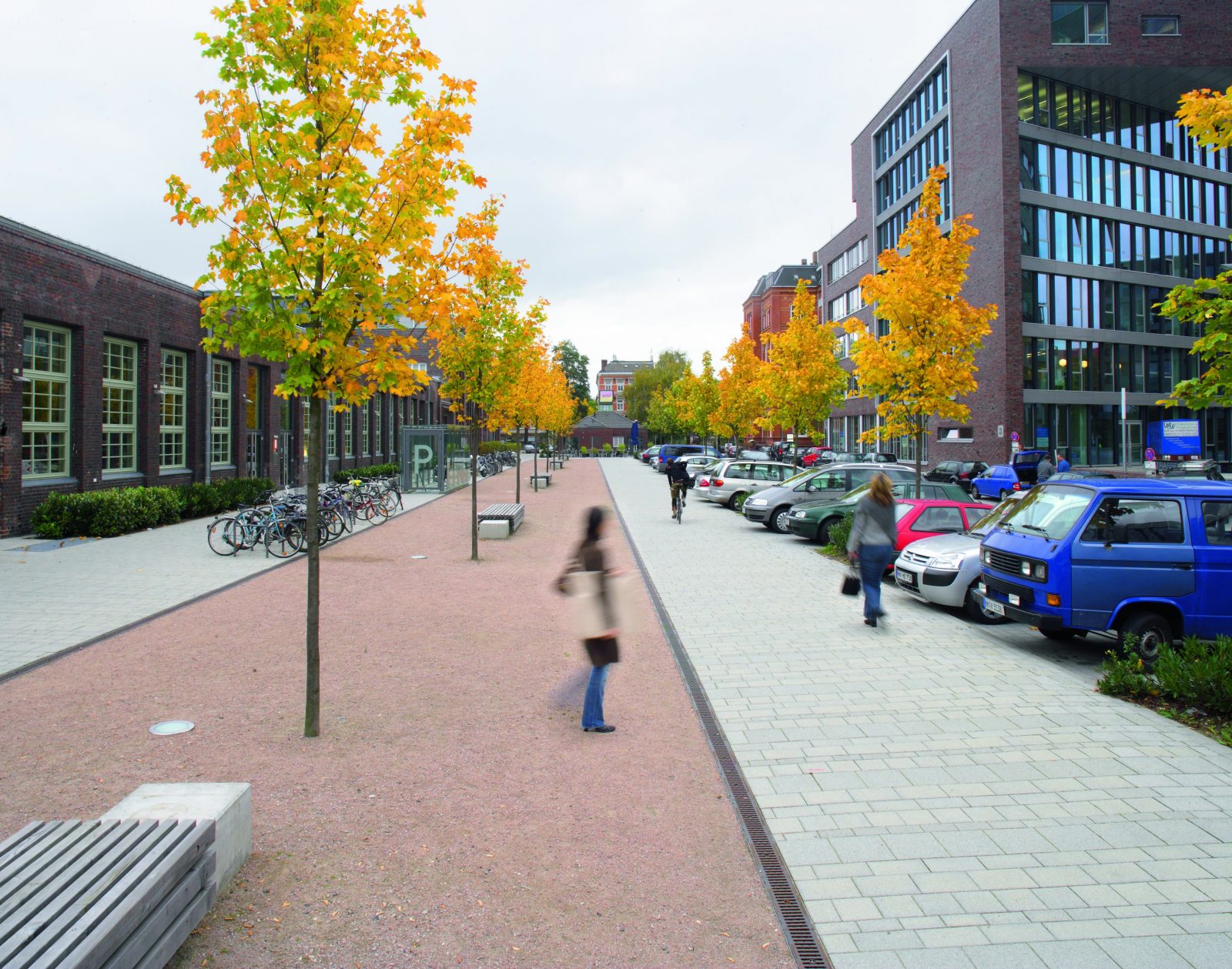 Denkmalgeschützte Industriebauten und eine Vielzahl moderner Architekturen geben dem neuen Stadtteil ein lebendiges Ambiente. Mit der einheitlichen Gestaltung des Außenraums sorgen wir für eine formale Zusammenführung. Wir beschränken uns bewusst auf drei Elemente: Material, Baum und Licht.