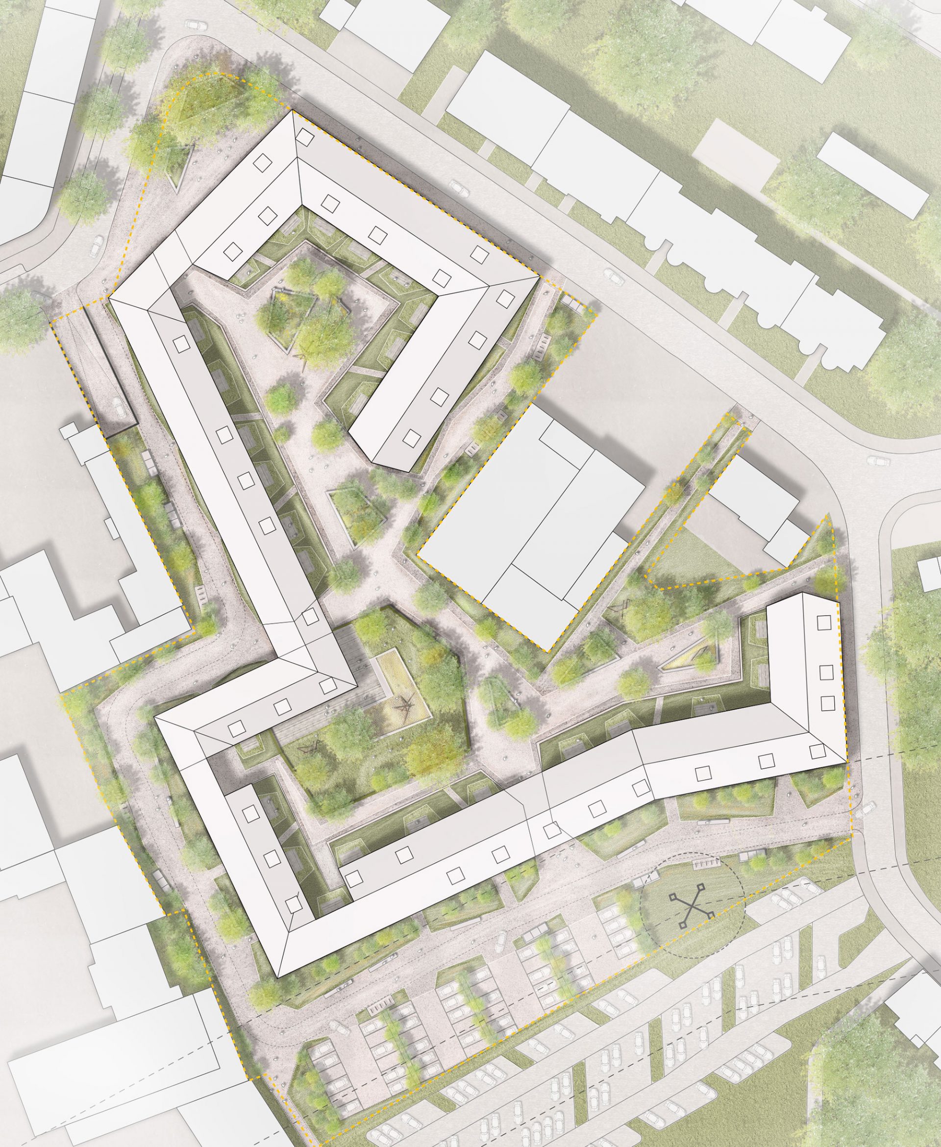 Im Zentrum der Freiraumgestaltung steht der Gedanke der gemeinschaftlichen Nutzung und der Interaktion. Ein grüner Rahmen aus Privatgärten und Pflanzflächen fasst den öffentlichen Raum. Sitzaufkantungen der um 45cm erhöhten Gärten und Hochbeete laden zum Verweilen und Kommunizieren ein. Die verspielte Geometrie der Freiflächen im Zusammenspiel mit der Architektur schafft individuelle und spannungsvolle Räume. Eine vielfältige Bepflanzung aus Gräsern, Stauden, Sträuchern und Solitärbäumen bieten zu jeder Jahreszeit eine farbenfrohe Atmosphäre. Locker verteilte Sandspielflächen und Spielgeräte schaffen für verschiedene Altersgruppen Angebote.