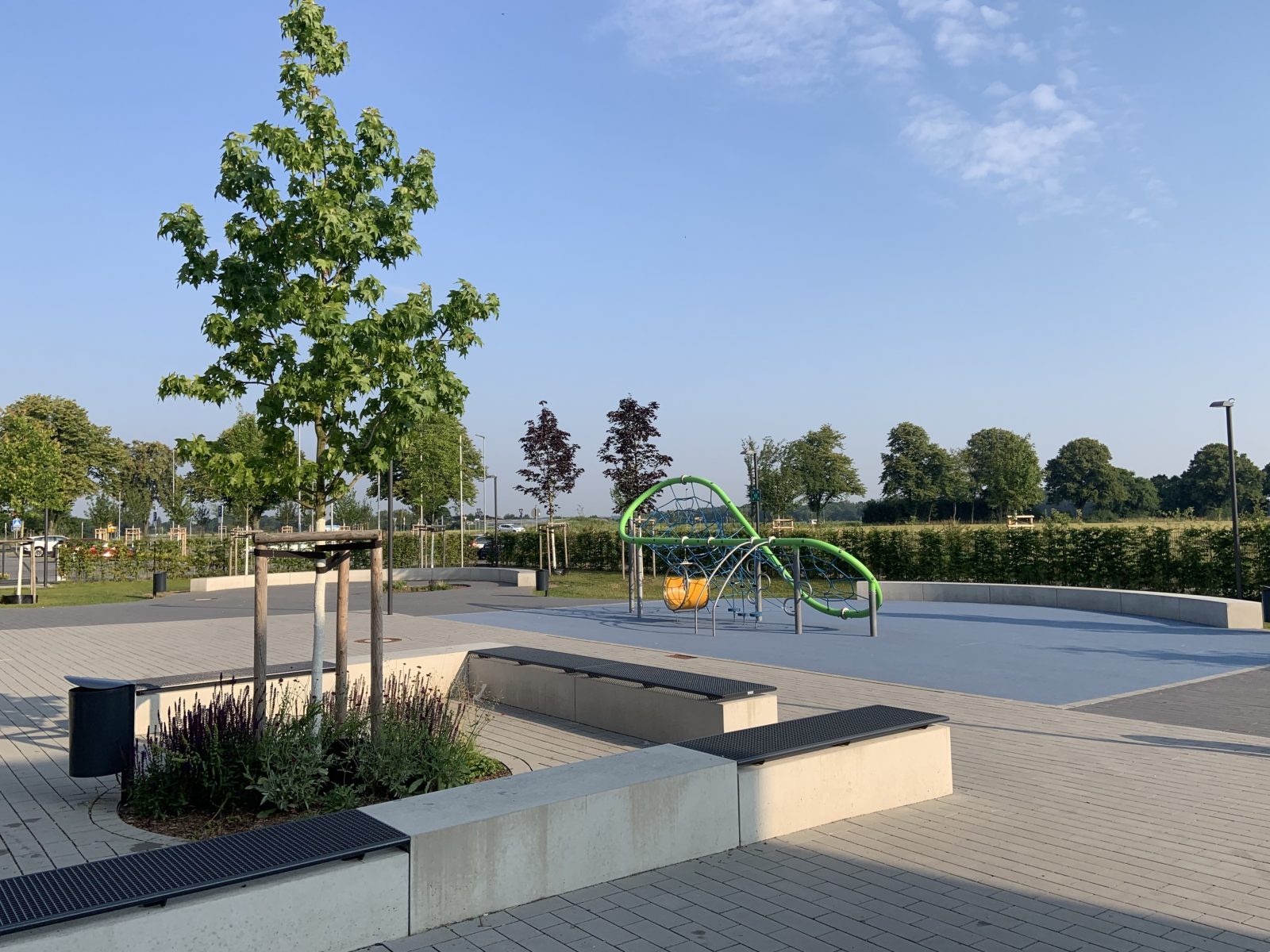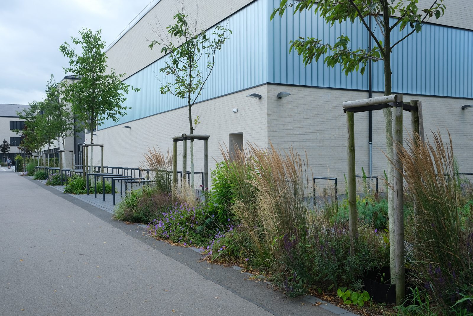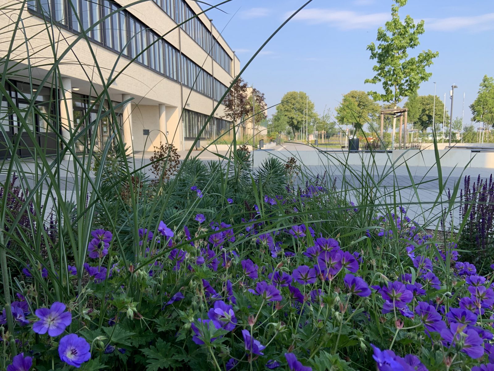 Auf dem gesamten Schulhof sowie in den Grünstreifen ergänzen Gehölz- und Strauchpflanzungen die organischen Grüninseln. Entlang des Fußgängerweges vom Risgeskirchweg in Richtung Haupteingang säumen Hochstämme den Weg. Die Gehölzpflanzungen sowie das Schulgebäude bieten ausreichend Beschattung auf dem Schulgelände. Alle Gebäudedächer werden dort, wo die technischen Erfordernisse es zulassen, mit einer extensiven Dachbegrünung versehen.