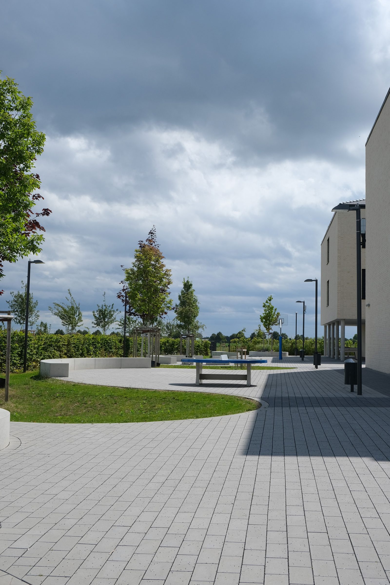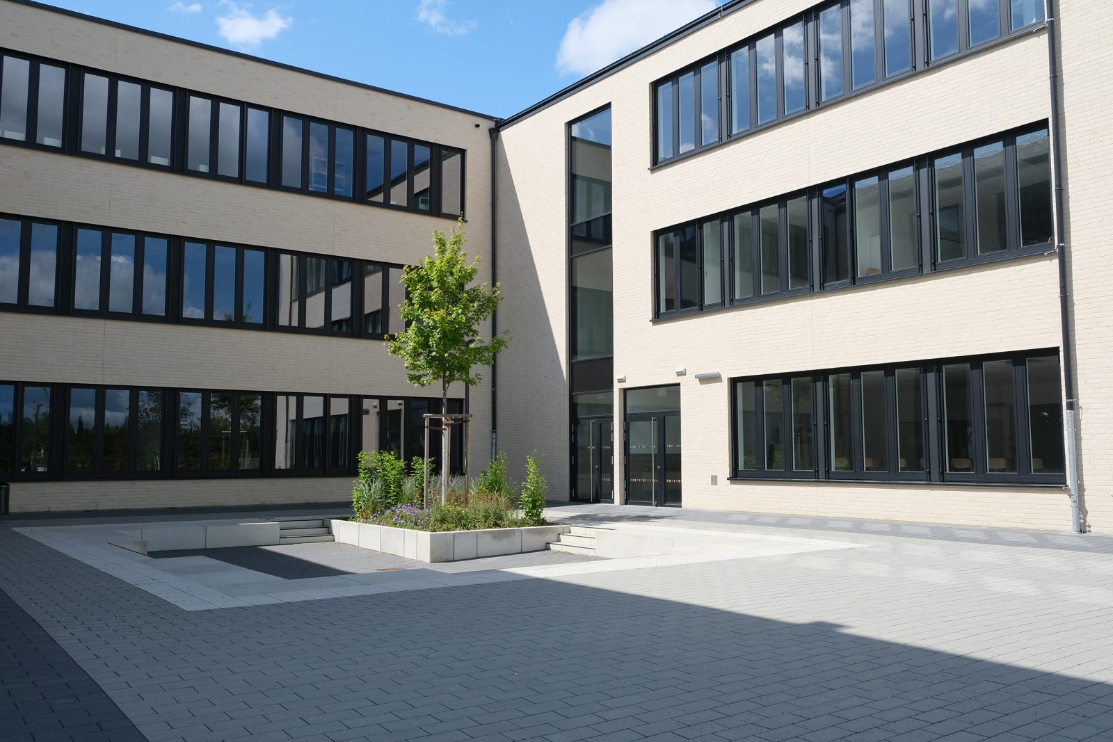 Die gesamte Schulhoffläche ist in anthrazitfarbenem Betonsteinpflaster ausgeführt. Ein vom Risgeskirchweg beginnender Pflasterbelag in hellbeige betont das Entree und leitet die Schüler in den Haupteingang des Komplexes. An diesen Teppich vor dem Eingang schließt eine Spielfläche an, die aufgrund ihrer zentralen Lage besonders für ein Großspielgerät geeignet ist. Alle weiteren Spielflächen fügen sich farblich sowie geometrisch an die Gebäudekontur an. Sie bieten viel Platz für die unterschiedlichsten Spielangebote und -geräte, wie z. B. Tischtennis oder Basketball.