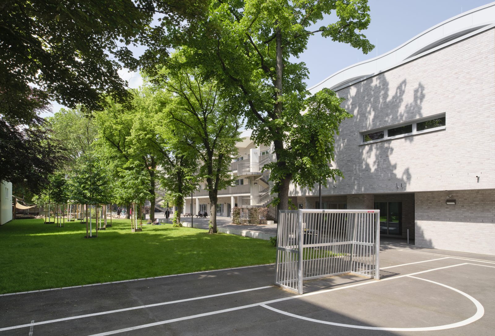 Die notwendigen 22 PKW- und 60 Fahrradstellplätze werden im westlichen Bereich des Geländes angeordnet und über die neue Zufahrt erschlossen. Ladestationen für E-Mobilität sind eingeplant. Eine „kiss and ride“-Zone an der Zufahrt erleichtert das sichere Ein- und Aussteigen der Schülerinnen und Schüler. Mit Bäumen bestandene Grünstreifen grenzen den Parkplatz zum Schulhof und den Nachbargrundstücken ab.