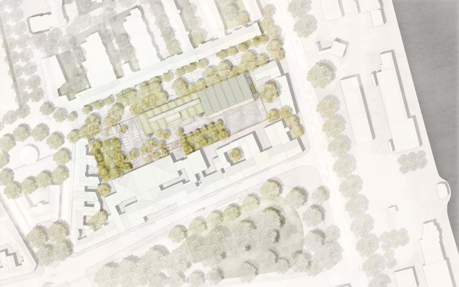 Der Pausenhof liegt eingebettet in einem Blockinnenbereich mitten in der Kölner Südstadt. Der wunderschöne Baumbestand prägt den bestehenden Raum und wird bestmöglich erhalten und in die neue Freiraumgestaltung integriert. Ziel der Freiraumgestaltung ist es, den Schulhof für Schüler*innen, Lehrer*innen und Besucher*innen zu attraktiveren und gleichzeitig in die bestehenden Freiflächen einzubinden.
