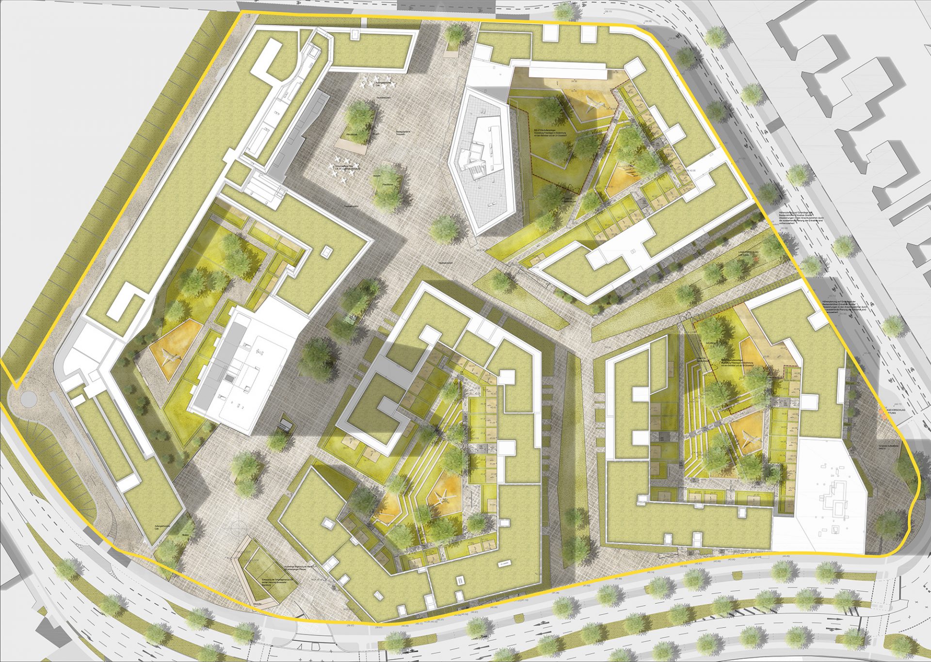 Im Unterschied zu den Pocket Parks wird die als Boulevard bezeichnete, wichtige Nord-Süd-Verbindung des Quartiers als urbaner, überwiegend befestigter Freiraum gestaltet. Räumliche Akzente setzen Sitzpodeste und Bankkonstruktionen. In Verbindung mit Vegetationsflächen und Gehölzpflanzungen schaffen sie in diesem Transitraum grüne Inseln mit Aufenthaltsqualität. Daneben wird im Norden ein urbaner, nutzungsoffener Stadtplatz mit Möglichkeiten für Außengastronomie und Veranstaltungen geplant. Die Dachflächen der Gebäude (außer den Hochhäusenr) werden, sofern nicht intensiv genutzt, extensiv mit Sedum-Kraut-Gras-Gesellschaften begrünt.