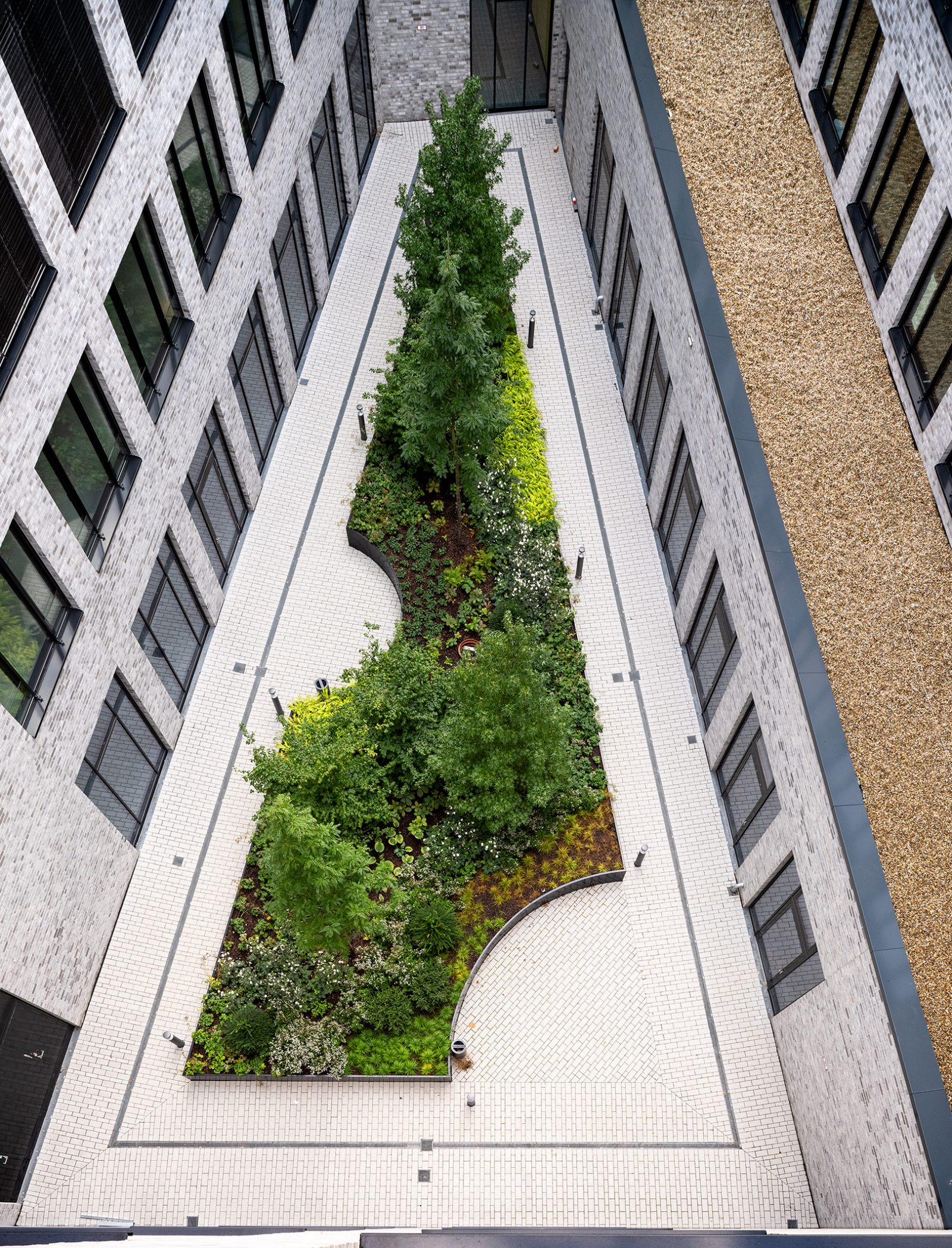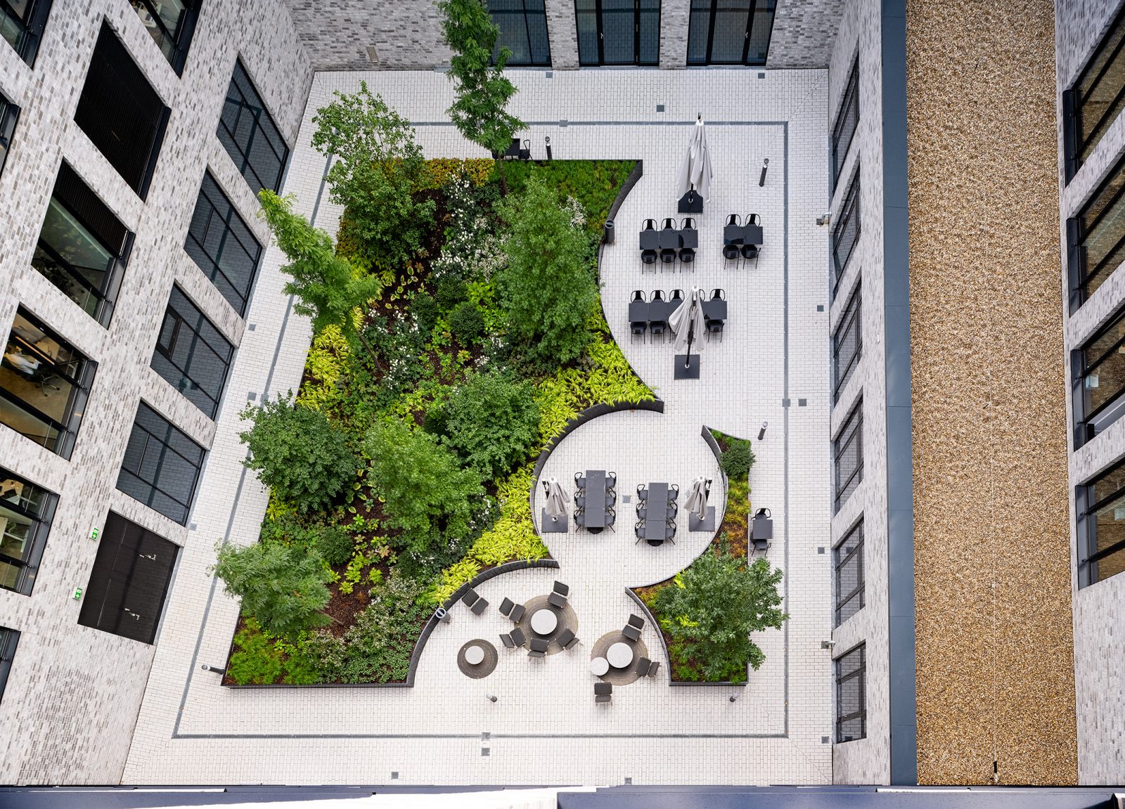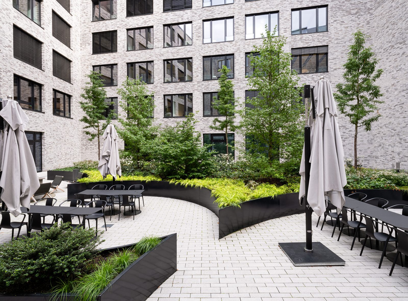 Die Baukörper 2 und 3 eröffnen jeweils im Inneren Innenhöfe in unterschiedlicher Größe, die einen Ausblick ins Grüne für die Mitarbeitenden ermöglichen. Die Innenhöfe sind mit einem hellen Betonstein mit Natursteinvorsatz in unterschiedlichen Formaten gepflastert. Polygonale Hochbeete aus anthrazitfarbenem Stahl mit radialen Aussparungen akzentuieren die Hofmitte. Das Pflanzkonzept sieht eine schattenverträgliche Unterpflanzung und Gehölze wie Liquidambar und Gleditsia vor.
