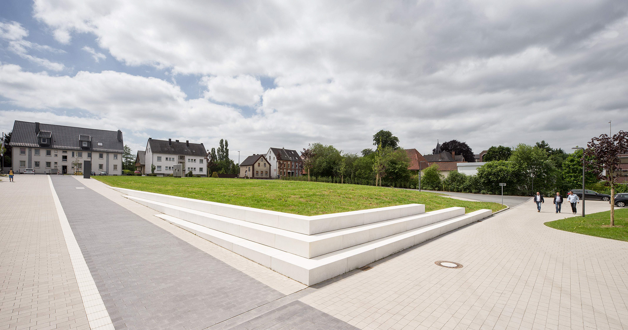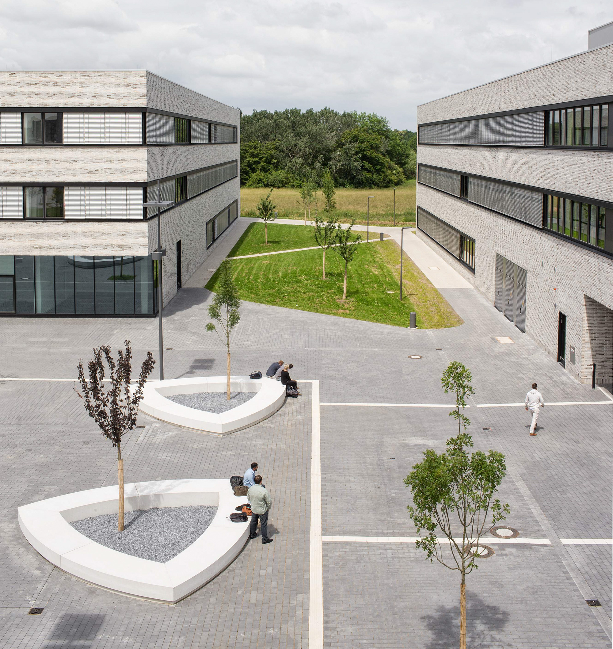 Alle Gebäude gruppieren sich um diesen zentralen Platz und bilden eine Mitte – den Campus. Langestreckte Sitzbänke und Solitärbäume rhythmisieren diesen Raum, bieten Platz für Kommunikation und Reflexion. Der Zugang an der Rixbecker Straße erfolgt über eine großzügige befestigte Achse.