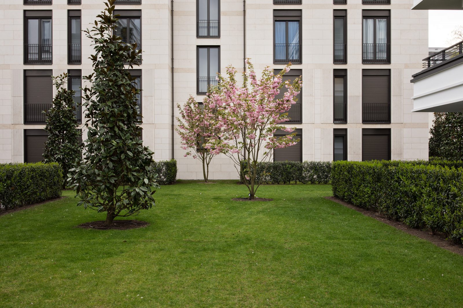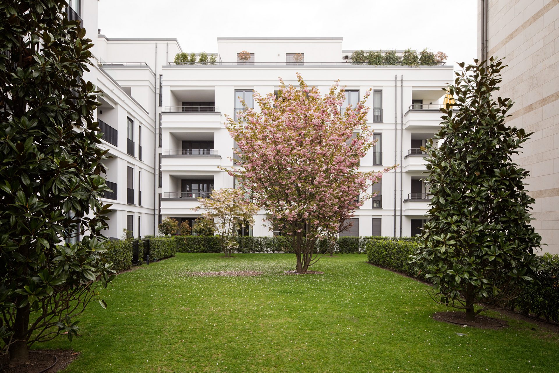 Die Erschließungswege werden mit einem Pflaster- oder Plattenbelag befestigt und erhalten eine Grundbeleuchtung. Die Mieterterrassen werden durch geschnittene Hecken von den Gemeinschaftsflächen abgegrenzt. Zwischen den rahmenbildenden Hecken und den Fußwegen beleben niedrige Gehölz-/Staudenpflanzungen das Gesamtbild.