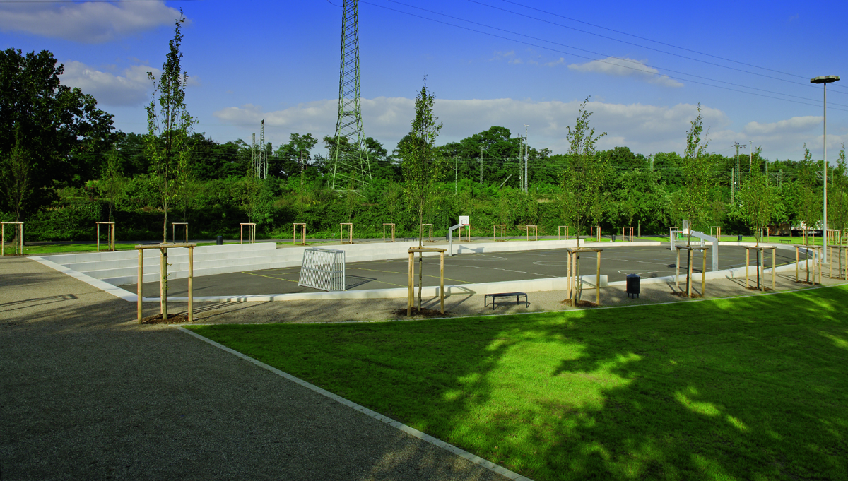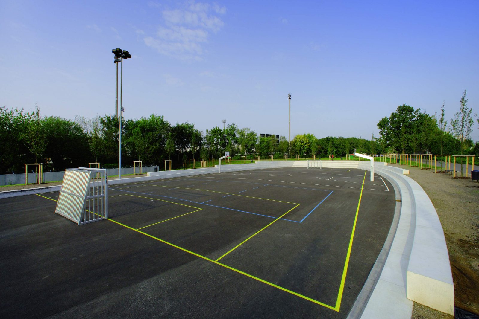 An die Idee des Volksparks anknüpfend, entstehen dort eine großzügige Spiel- und Sportarena in Form eines von Säuleneichen umstellten Sitzovals. Hier können sich Jugendliche beim Kicken, Skaten, Basketball oder Rollhockey austoben und im Winter sogar Schlittschuhlaufen. Ergänzt wird das Angebot durch Rasen- und Wiesenflächen zum Sonnenbaden und Picknick.