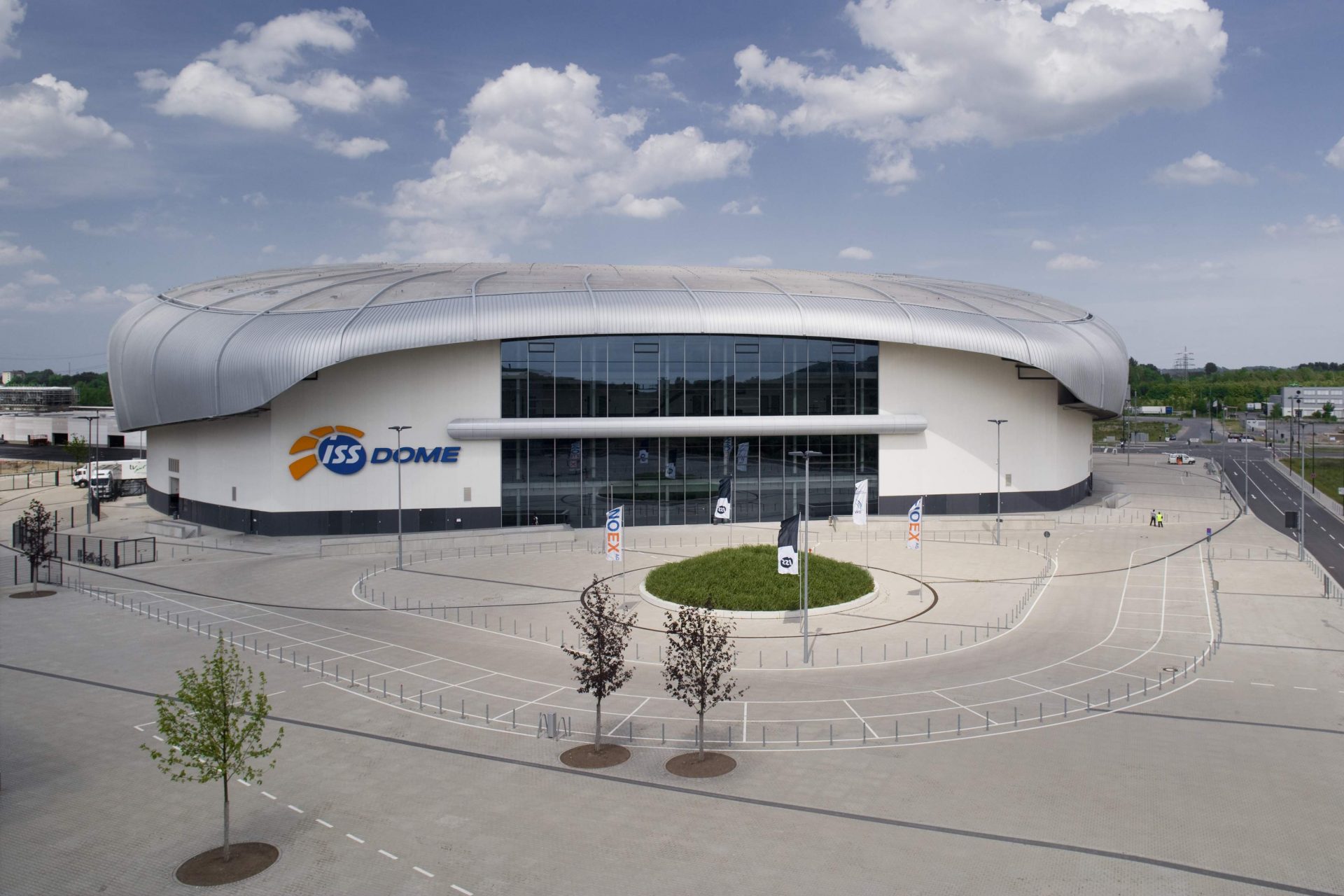 Ein bepflanztes Kreiselement definiert den Vorfahrtsbereich des VIP-Einganges. Zur weiteren Raumbildung sind grüne Baumdächer aus unterschiedlichen Ahornarten locker auf dem Platz angeordnet.