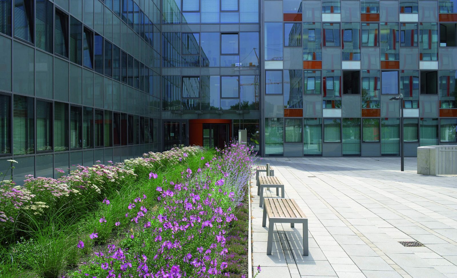 Die Architektur des IT-Zentrums bildet den Rahmen für einen Multifunktions-Freiraum. Hier konnten wir mit unserem Entwurf alle Nutzer*innen-Interessen optimal verbinden: Die ebenerdige Decke der Tiefgarage wurde dabei zur Plattform für einen repräsentativen Vorplatz, für einen freundlichen Treffpunkt, einen abwechslungsreichen Pausenhof und eine grüne Caféterrasse.