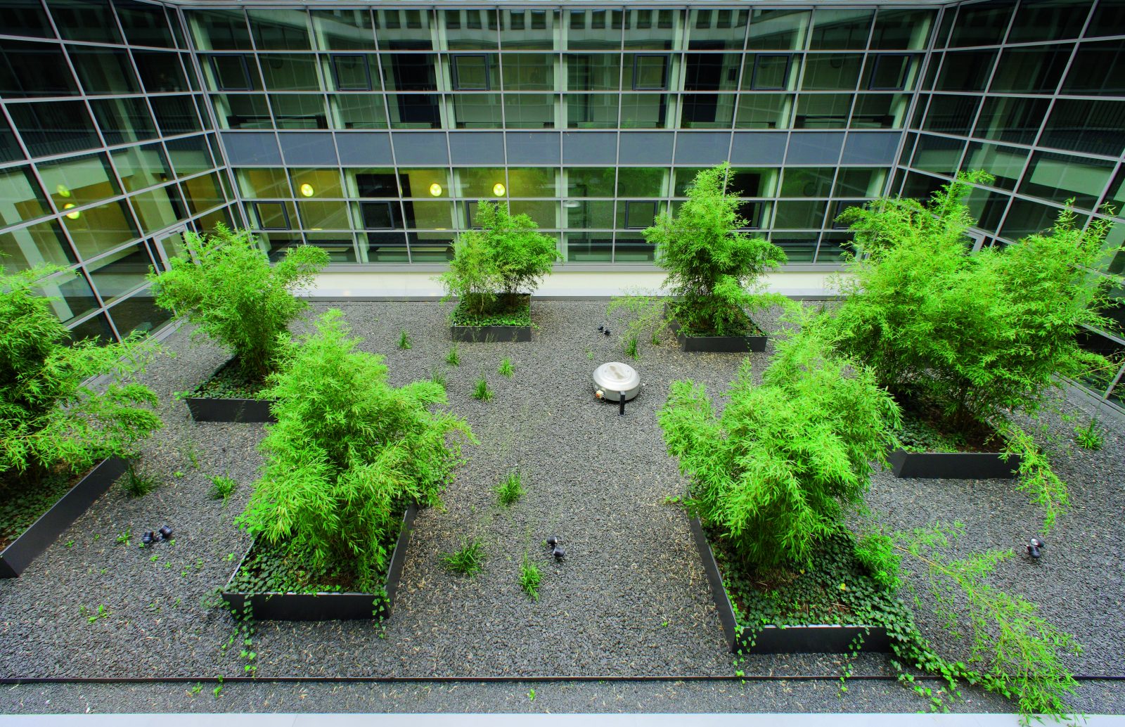 All dies, die Bepflanzungen der Dachlandschaften und Atriumhöfe sowie Solitärgehölze, Weiden, Stauden und Gräser machen die Insel zwischen den Wupperarmen zu einem grünen und eben doch städtischen Eiland.