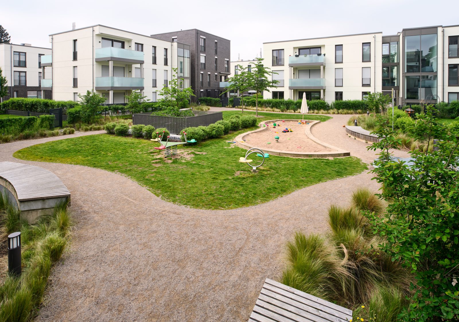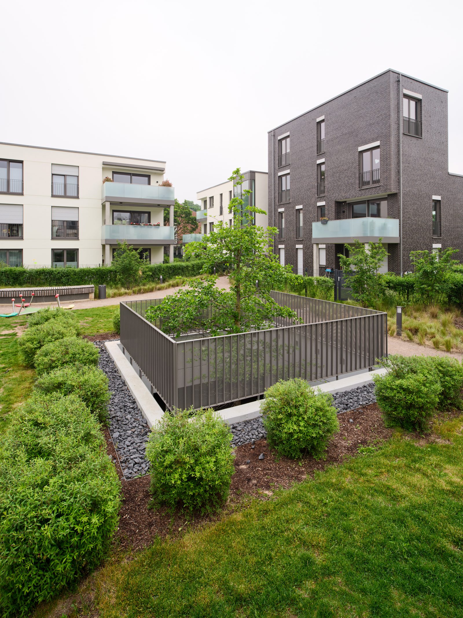 Die Außenanlagen des Bauvorhabens gliedern sich in die öffentlichen Erschließungsflächen, die halböffentlichen autofreien und behindertenfreundlichen Gemeinschaftsflächen der Geschossbauten und die privaten Gärten.