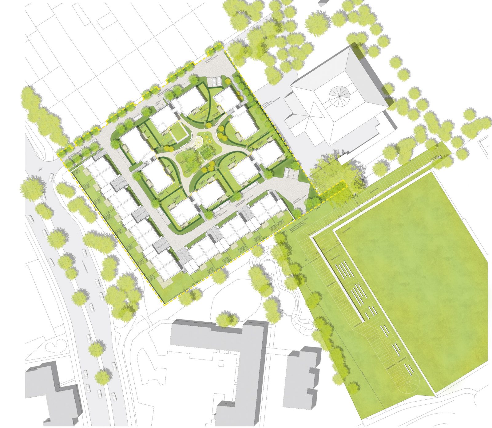 Die Außenanlagen des Bauvorhabens gliedern sich in die öffentlichen Erschließungsflächen, die halböffentlichen autofreien und behindertenfreundlichen Gemeinschaftsflächen der Geschossbauten und die privaten Gärten.