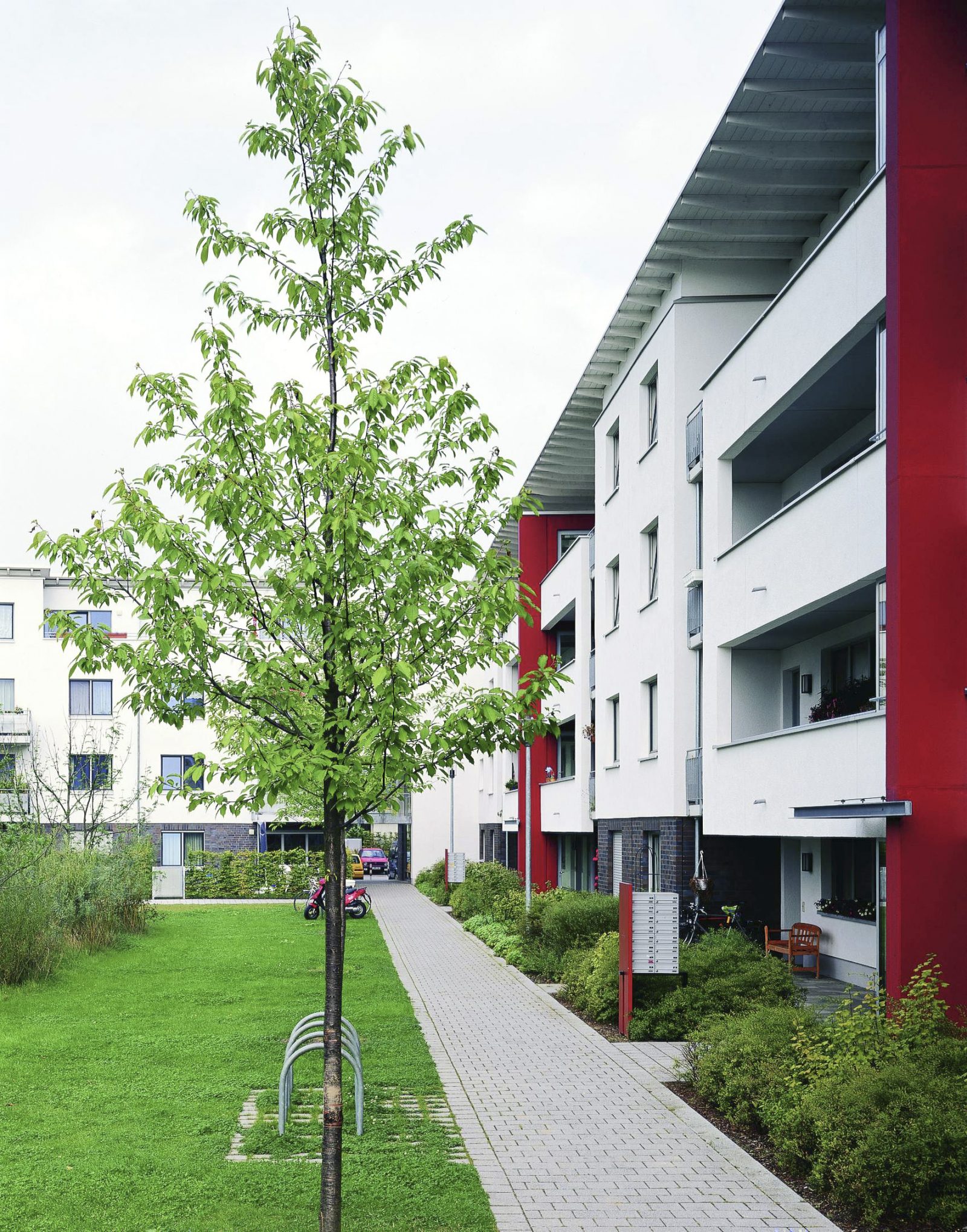 Einheimische Laubbäume gliedern die Platz- und Hofräume, überstellen schattenspendend Plätze und Wege. Rasen und Betonsteinpflaster ermöglichen eine lokale Versickerung des Regenwassers.