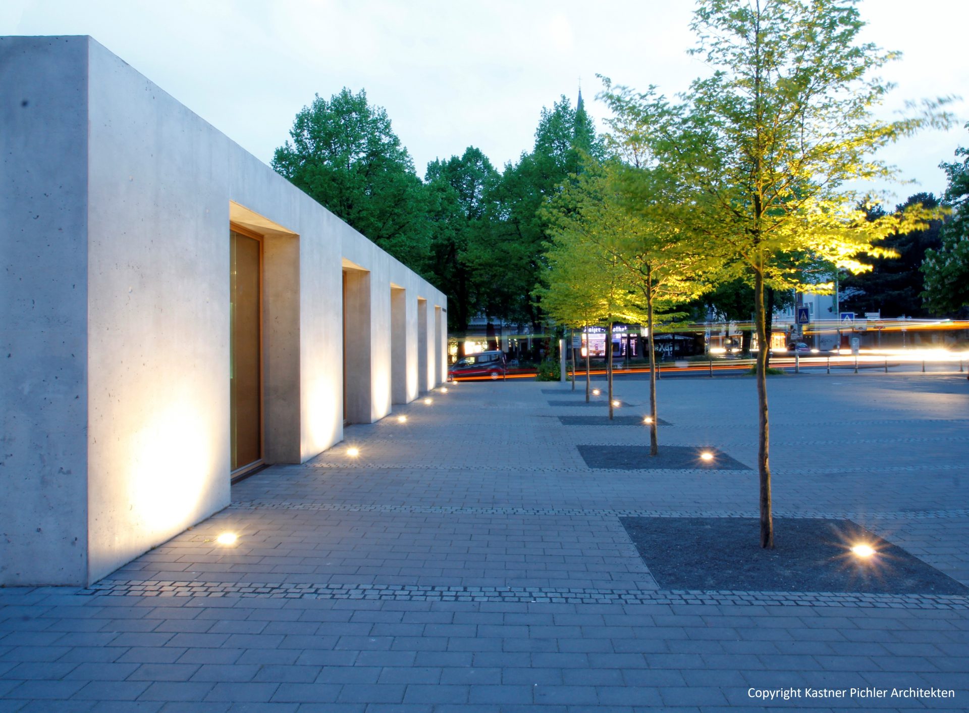 Im Zuge des Neubaus wird auch die Platzoberfläche neu gestaltet. Kleinformatige Natursteinpflasterstreifen strukturieren die Platzfläche. Eine linienhafte, offene Entwässerungsrinne nimmt den Bezug zum Kirchgebäude und dem Neubau auf.