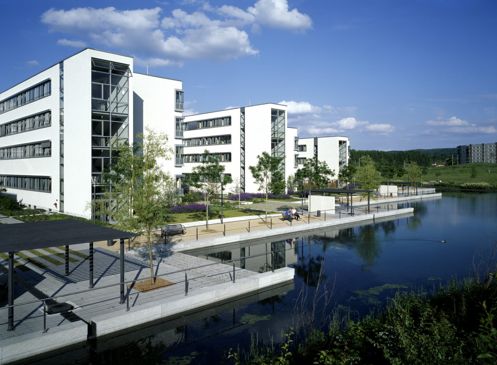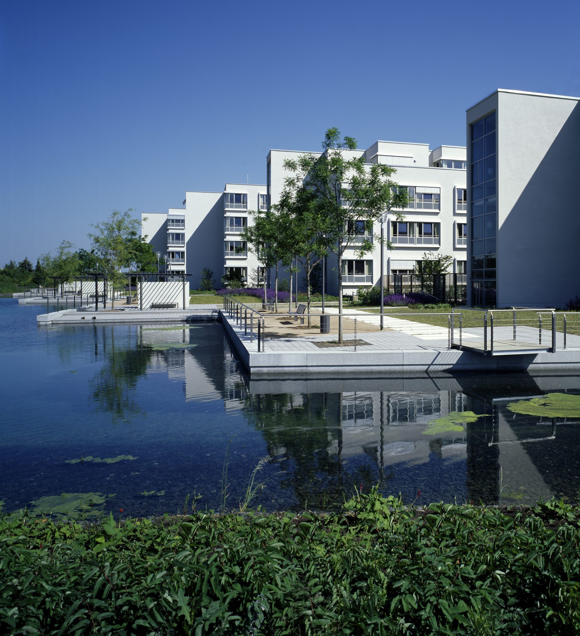 Schnittstellen von Klinikum und Landschaft sind die Patientengärten: „grüne Finger“ in der Kammstruktur der Bettenhäuser. In Farbe und Textur vielfältig bepflanzt, dienen die Gärten als genesungsfördernde Aufenthaltszonen, bieten anregende Ausblicke aus den Krankenzimmern. In Rinnen und Becken fließt Wasser zur Promenade am See. Wasserspiele schaffen eine heitere Atmosphäre. An den Mündungen laden berankte Pavillons zur Begegnung ein. Die streng geometrische Promenade und das gegenüberliegende weiche Ufer mit einem breiten Schilf- und Röhrichtgürtel bieten einen abwechslungsreichen Erlebnisraum. Eine kleine Insel ist attraktiver Aussichtspunkt und Rückzugsbereich für Wasservögel; im Frühjahr setzt hier ein Blütenmeer aus gelben Narzissen farbenfrohe Akzente.