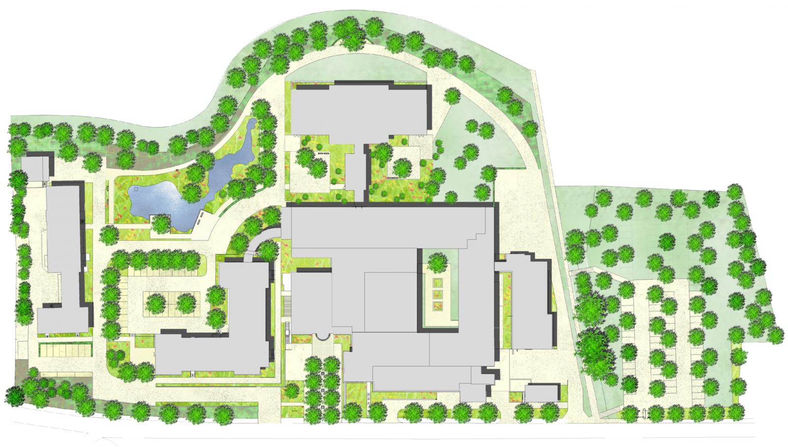 Organisation kombiniert mit anspruchsvollen Freiräumen bestimmt auch den Park. Liegendanfahrt, Betriebshof, Feuerwehrumfahrten und Stellplätze sind integriert in vielfältige Staudenpflanzungen und Hecken. Eine großzügige Wasserfläche dient als Löschteich und Erholungsraum zugleich. Unter den hohen Bäumen eines Hains finden die Patienten Spazierwege und Plätze zur Entspannung und Erholung.