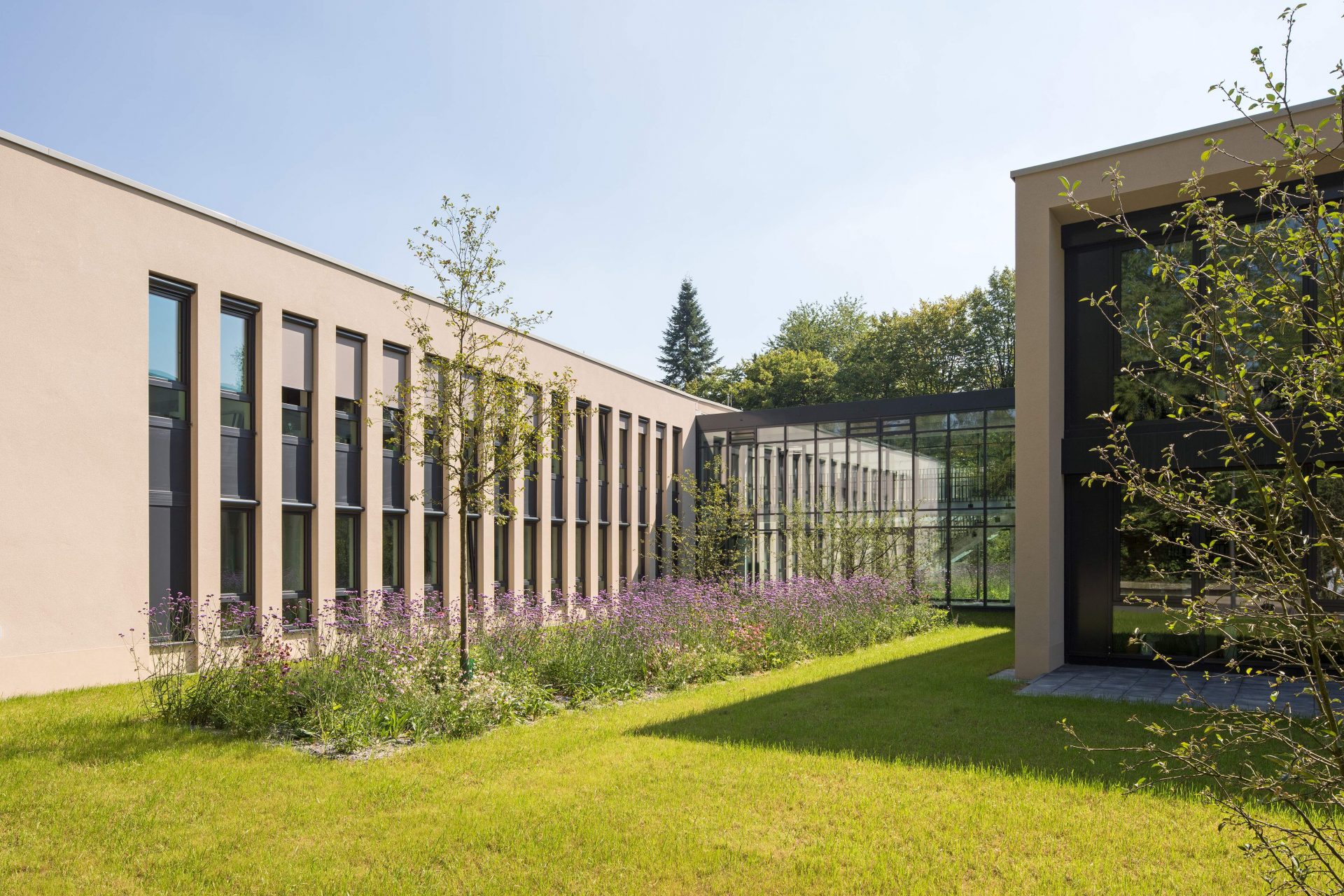 Grundidee des Gestaltungskonzeptes der Freianlagen war es, in der sich zur Umgebung kammartig öffnenden Gebäudestruktur, blühende Gartenhöfe zu gestalten, die ein attraktives Bild in die Arbeitswelt transportieren. Ganz oben Stand der Wunsch, eine Pflanzung zu entwickeln, die gleichermaßen Insekten und Bienenweide ist.