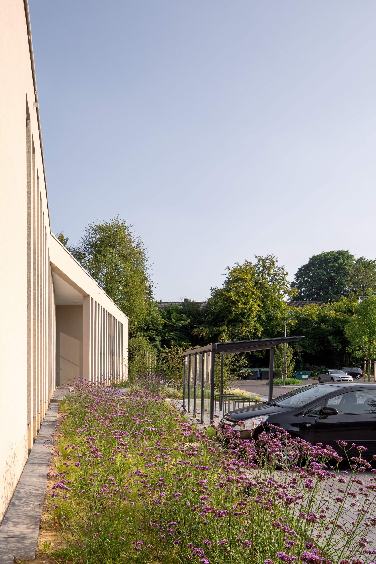 Hainbuchenhecken bilden die Einfriedung der Fahrradabstellplätze und Müllräum,e in dem sie diese für den Betrachter ausblenden.