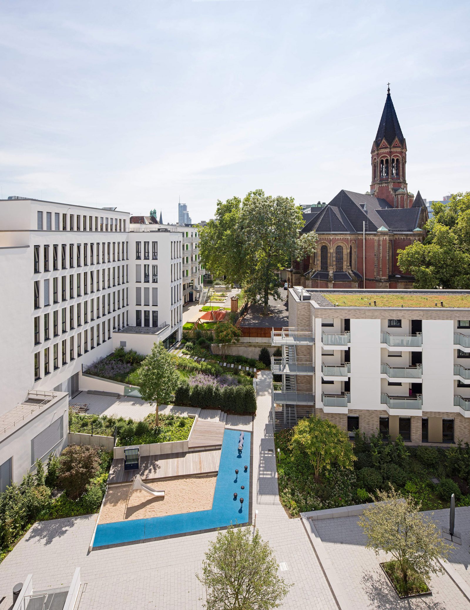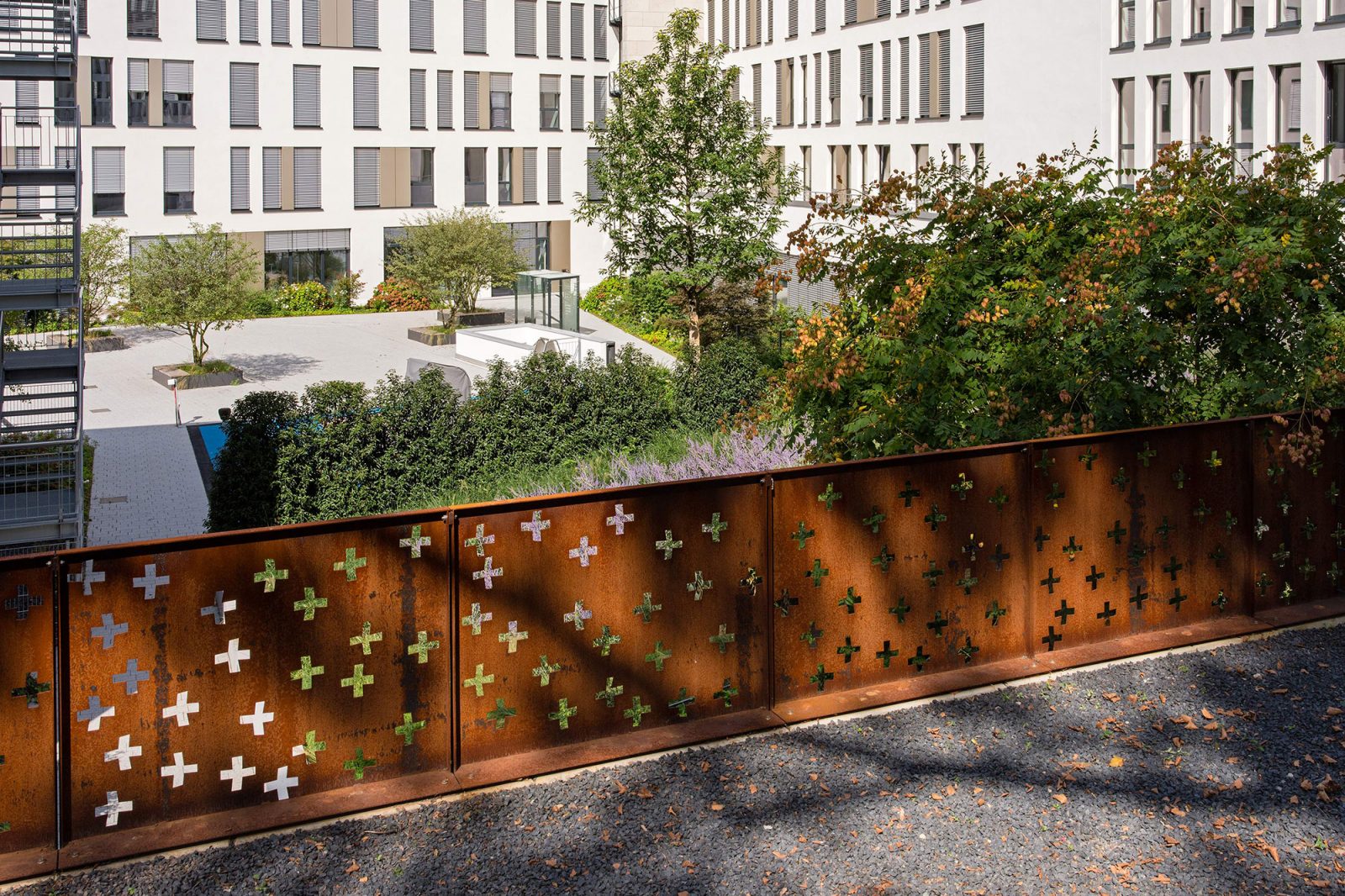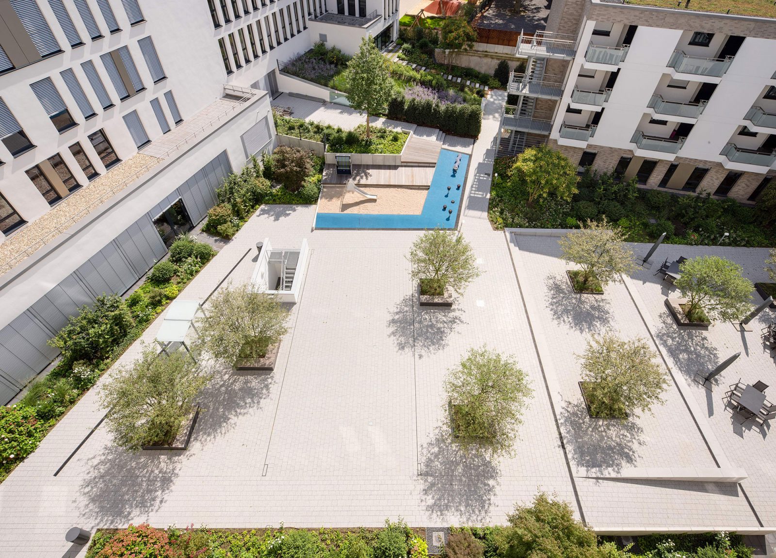 Die attraktiv gestalteten Grünflächen sollen einen harmonisierenden Ausgleich zur geschäftigen Arbeitswelt im Inneren schaffen. Vor dem Fitnessraum entsteht eine Holzterrasse, die in den Pausen das „Luft holen“ unter freiem Himmel ermöglicht. Die neue Außenterrasse des Cafés soll die städtebauliche Situation und die Aufenthaltsqualität am Platz verbessern. Es soll ein identifikationsstarker Ort entstehen, der für das gemeinschaftliche Leben in der Begegnungsstätte eine angemessene Umgebung bietet.