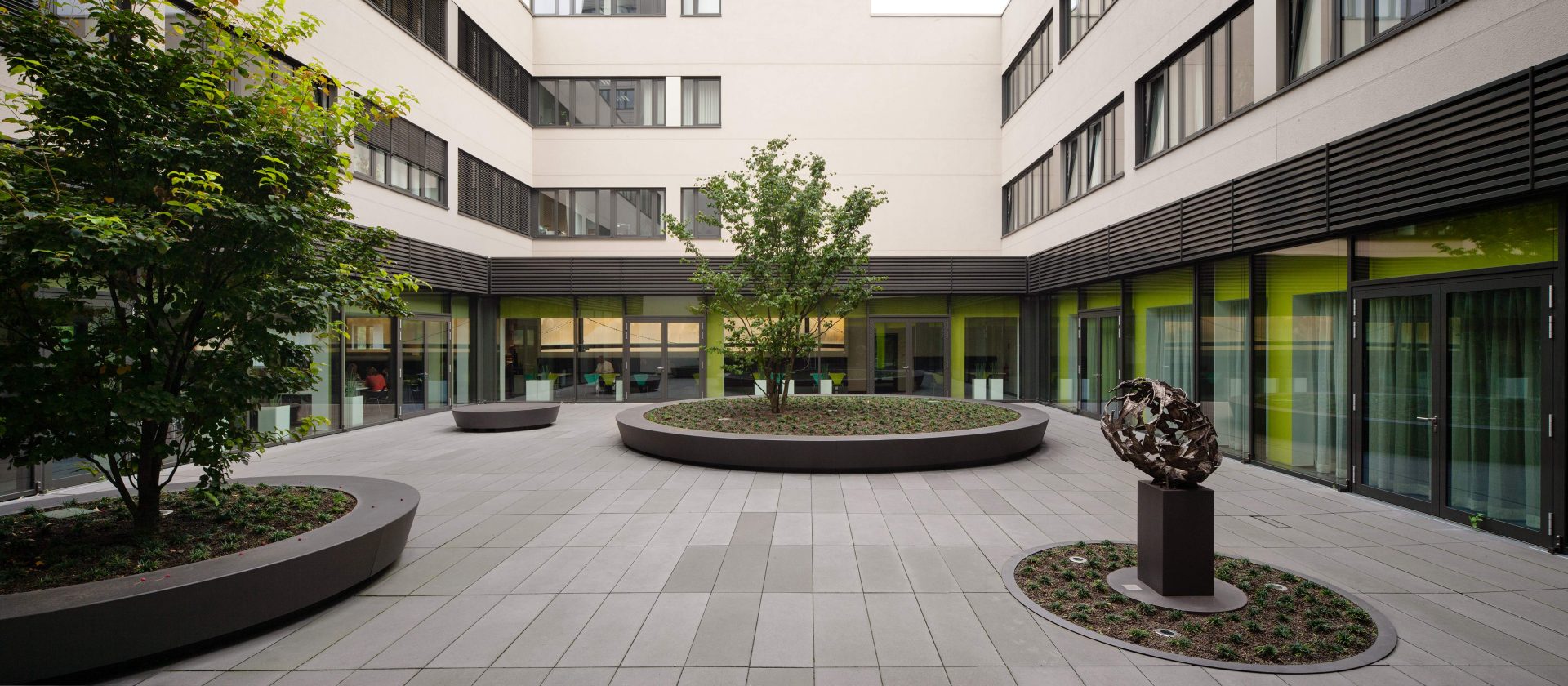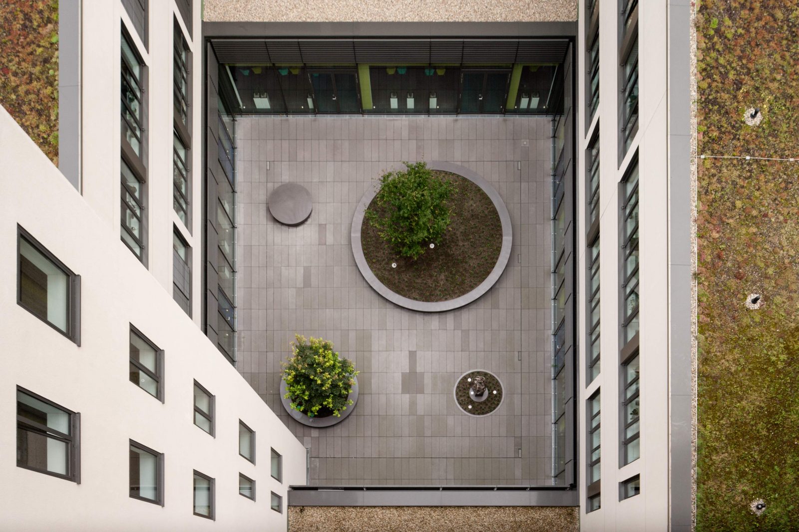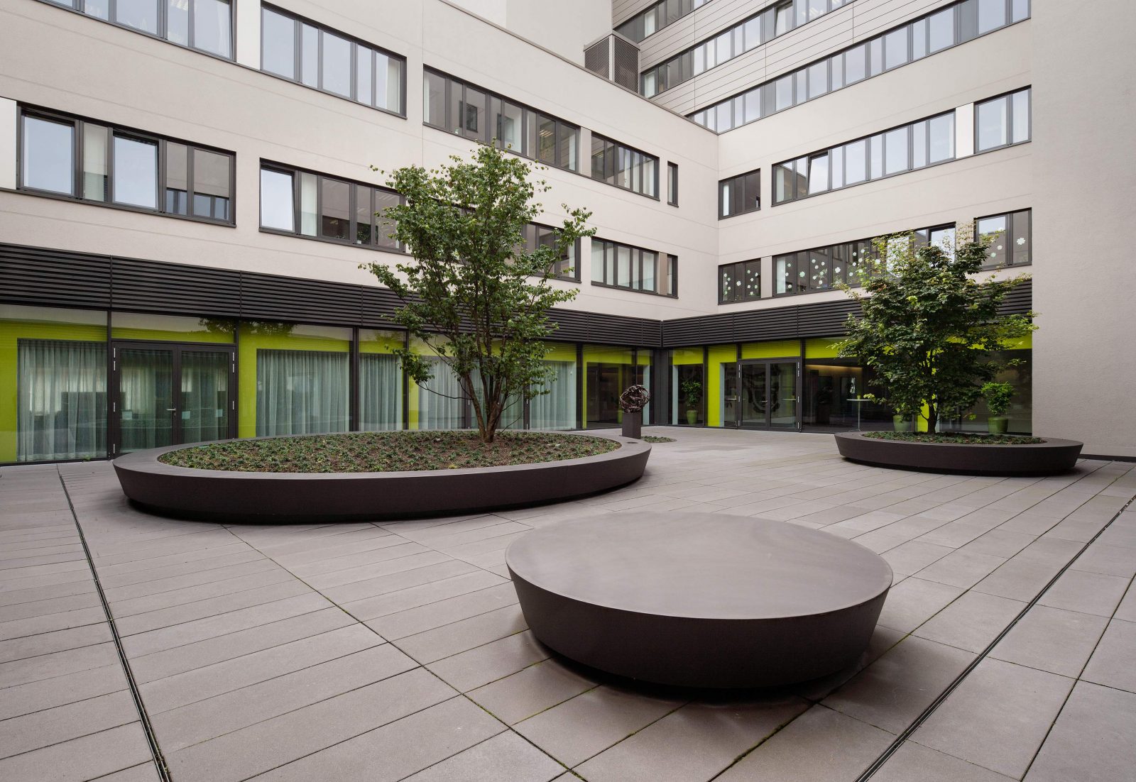 Ein strenges Raster aus großformatigen, anthrazitfarbenen Betonsteinplatten zieht sich als Bodenbelag durch den Hof. Runde Stahlelemente heben sich in Form von Pflanzbeeten und Sitzinseln daraus hervor.