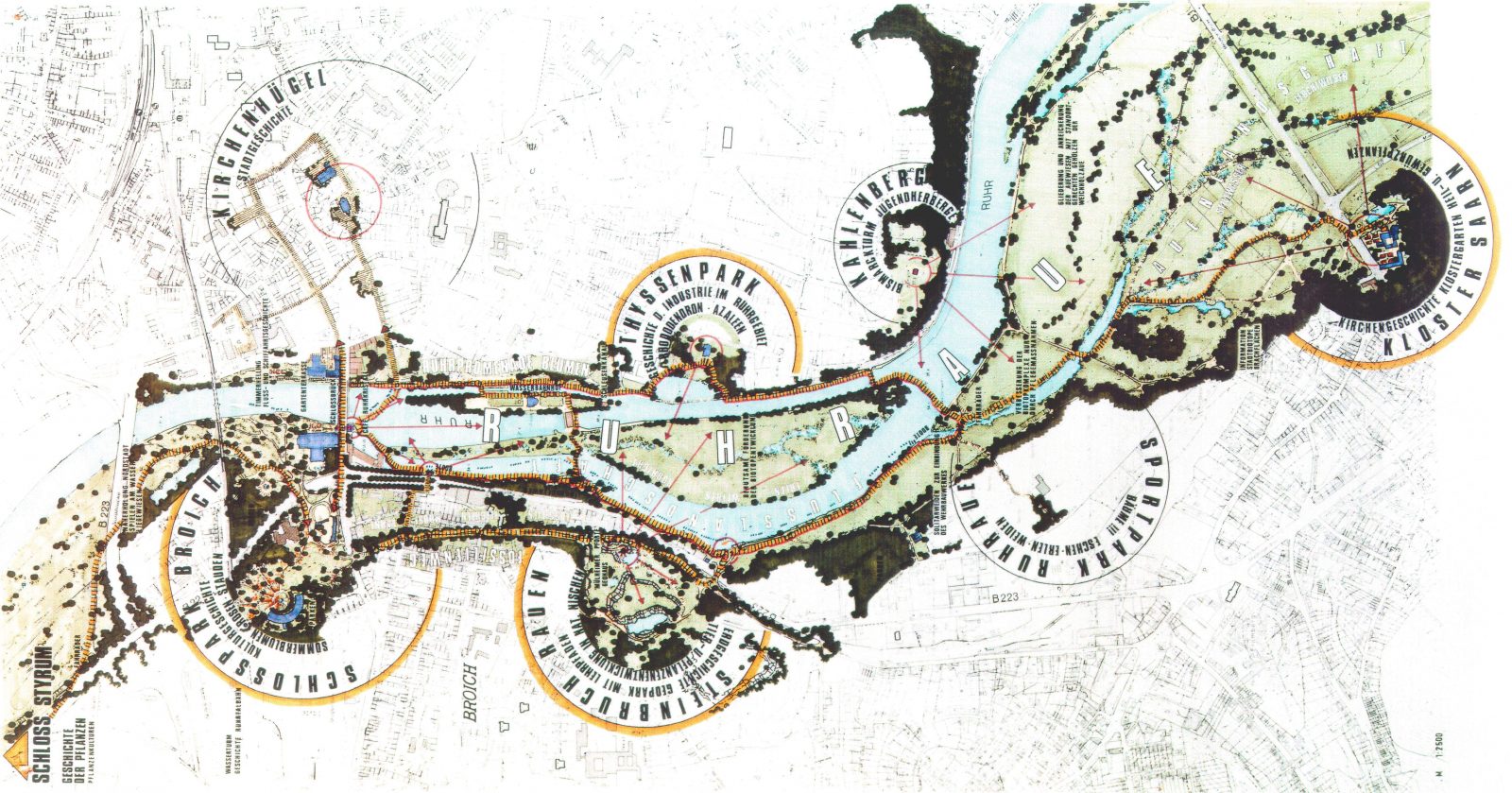 Als Wettbewerbssieger ist die Planungsgruppe Horst Wagenfeld und Wolfgang R. Mueller Mitte 1987 mit der Gesamtplanung und Realisierung des Projektes beauftragt worden. Entwurfsphilosopie war keine einheitliche Formensprache oder eine Großform, sondern der Bestand an Grünanlagen und industriell geprägten Elementen. Die Leitlinien bilden einerseits der Fluß durch die Stadt, an dessen Ufern und Talhängen sich einzelne Themenbereiche aneinanderreihen, und andererseits die parallel verlaufende Gleistrasse der stillgelegten Ruhrtalbahn in Form von Bahndämmen und Hangeinschnitten.