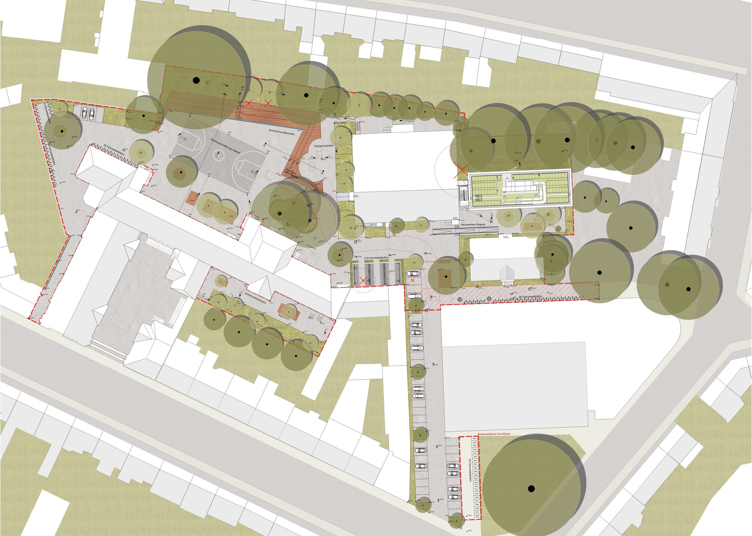 Rund um die Eingangsbereiche des Schulhofs werden 422 Fahrradstellplätze realisiert, die in verschiedenen Gruppen zusammengestellt sind. Um eine möglichst effiziente Flächennutzung zu ermöglichen, werden die Fahrradstellplätze unterschiedlich ausgebildet, als Doppelstock-Fahrradsysteme, Fahrradösen und Fahrradanlehnbügel.