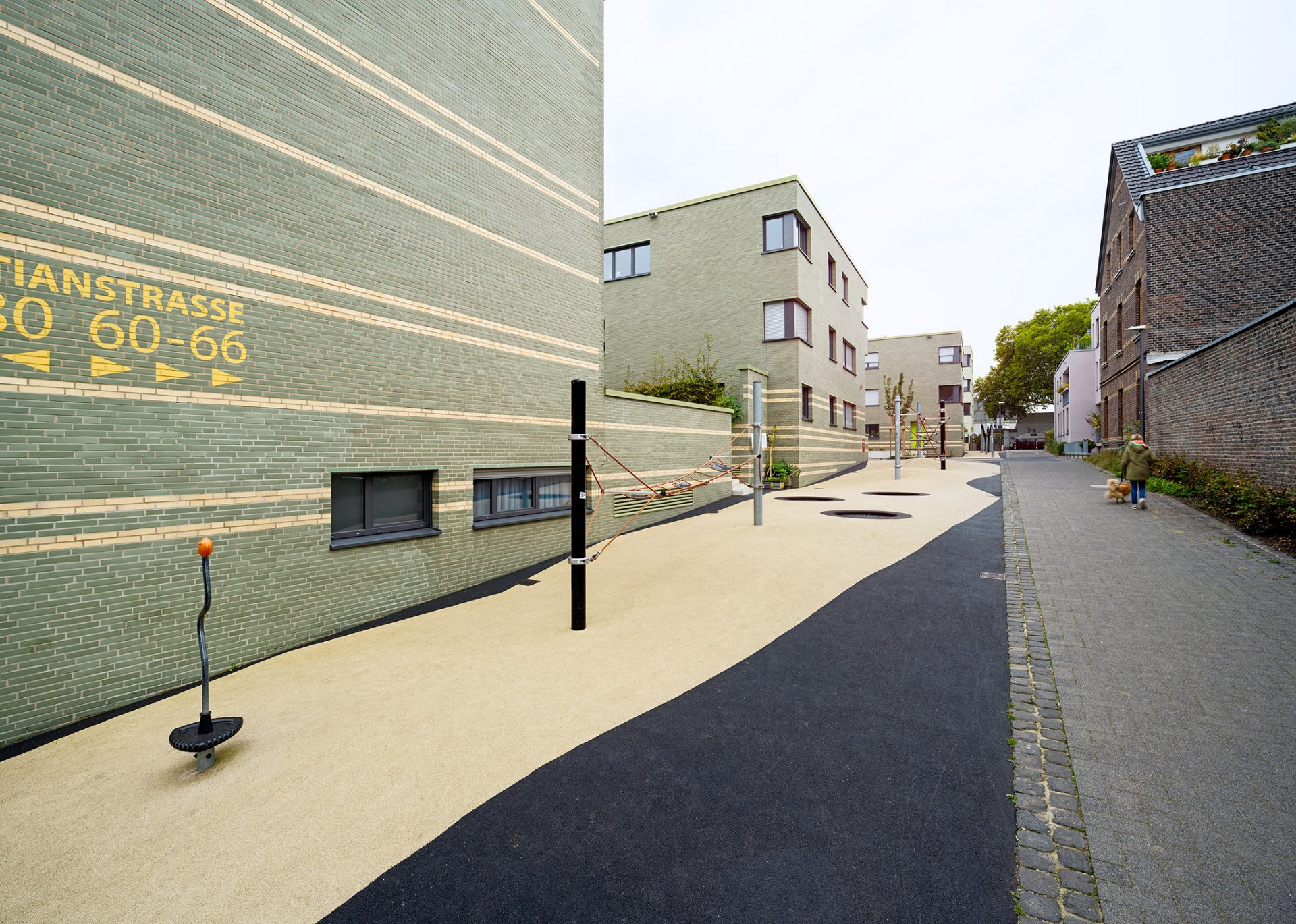 Die Leyendeckerstraße und die Christianstraße werden über eine fußläufige Straße miteinander verbunden. Vor Gebäude C weitet sich die Verbindungsstraße auf, sodass eine Platzfläche entsteht, von der aus die Hauseingänge von Gebäude C über eine Stufenanlage erschlossen werden. Der barrierefreie Zugang zu Gebäude C wird über die Zuwegung durch den Innenhof der Anlage gewährleistet. Die Zugänge zu Gebäudeteil A liegen ebenfalls im Innenhofbereich und sind zusätzlich über einen Stichweg an der südlichen Grundstücksgrenze zu erreichen. Der Gebäudeteil B wird von der Christianstraße aus erschlossen, wo sich neben den Wohnungseingängen auch die Tiefgaragenzufahrt befindet. Aufgrund der unterschiedlichen Höhensituation zwischen Leyendeckerstraße und Christianstraße befinden sich die Eingänge zu Haus B in der Untergeschossebene. Die Zugänge zu Haus A und C liegen in der EG-Ebene.